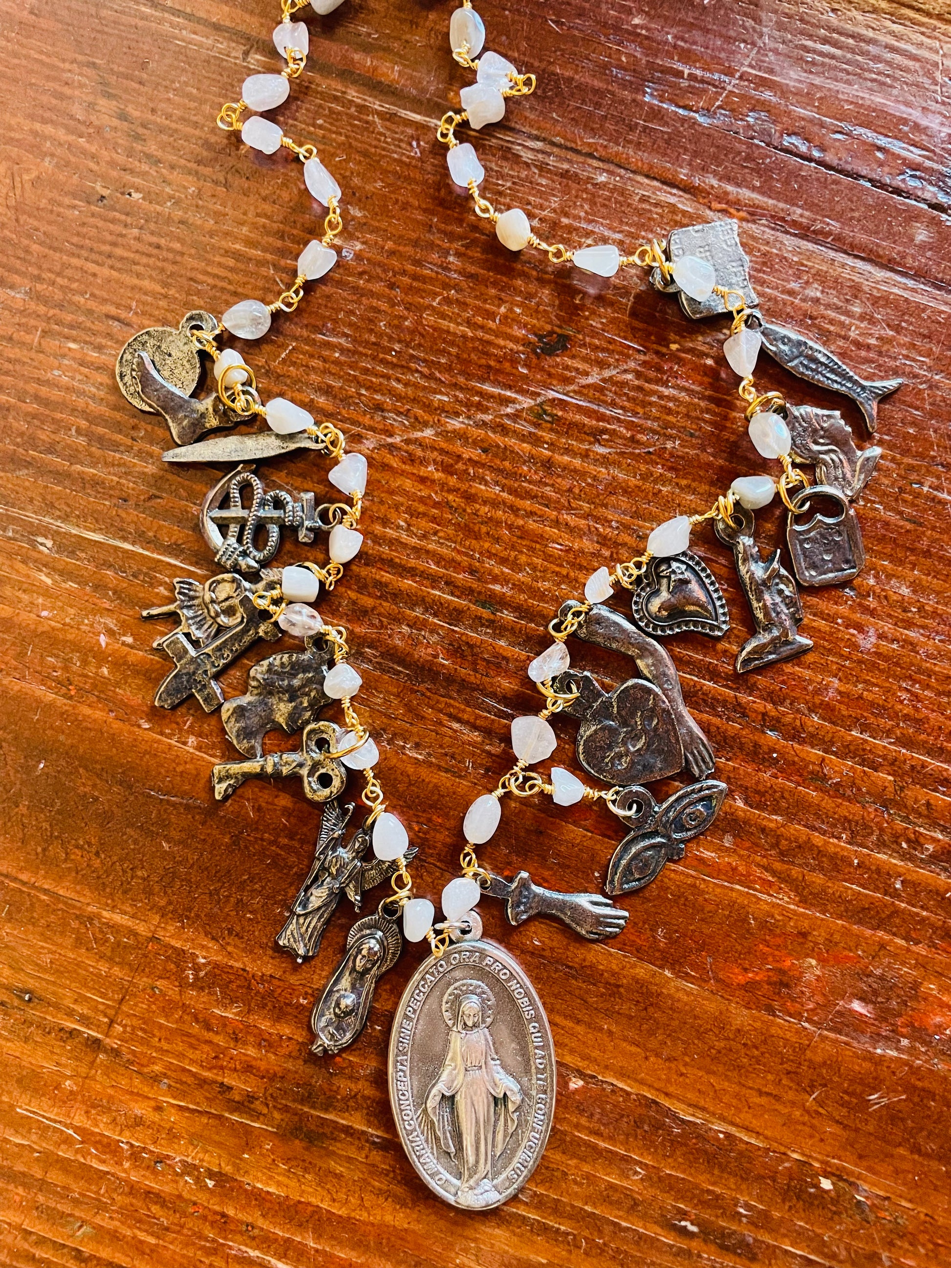 Questa collana è più lunga di quelle che faccio di solito, perché deve avere lo spazio per ospitare la sua anima: i Milagros messicani.
