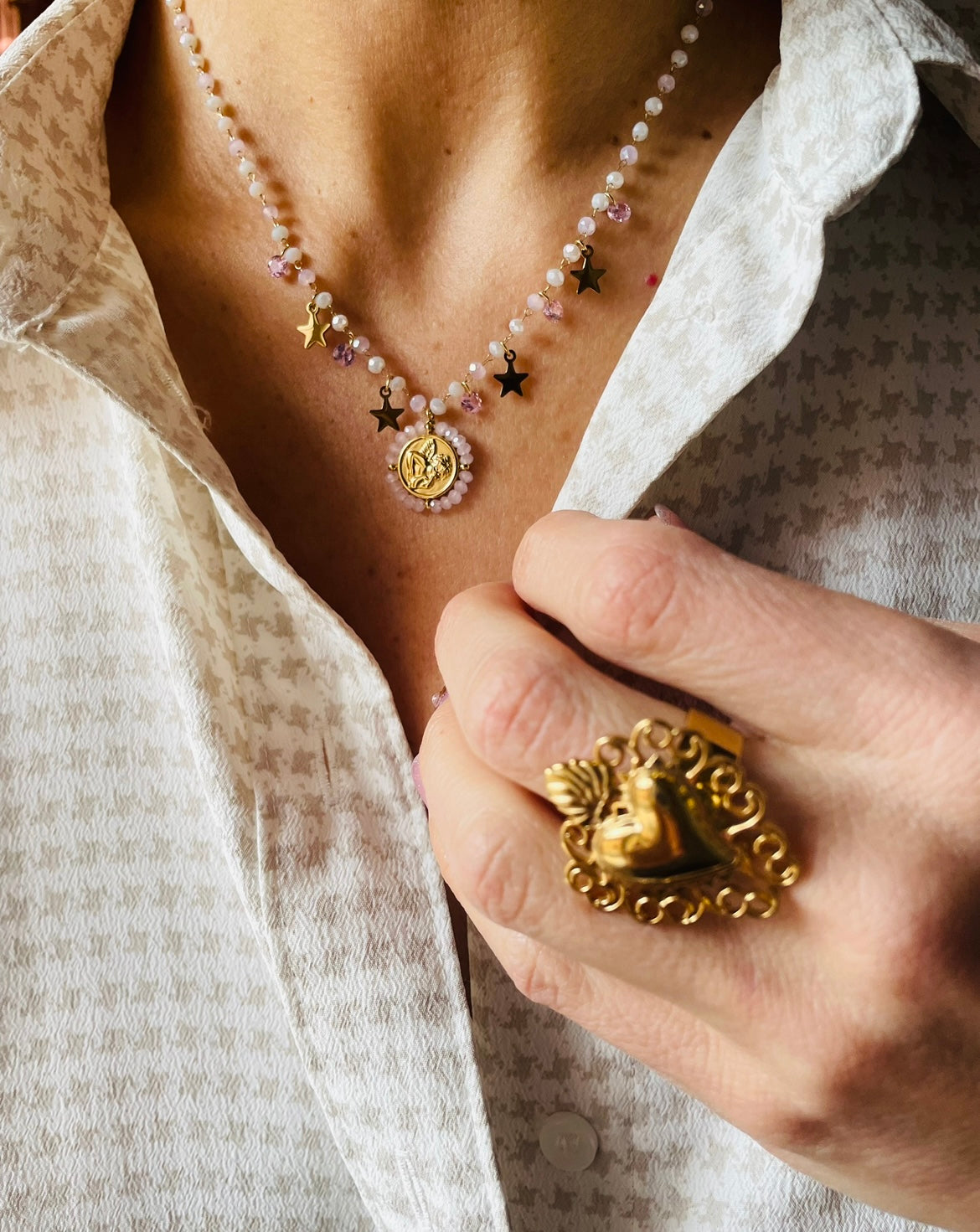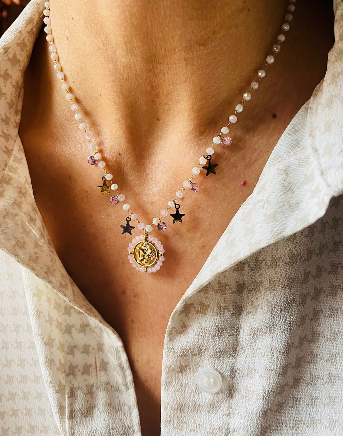 Collana in acciaio inossidabile con stelline dorate e perline in cristallo sui toni del rosa chiaro.