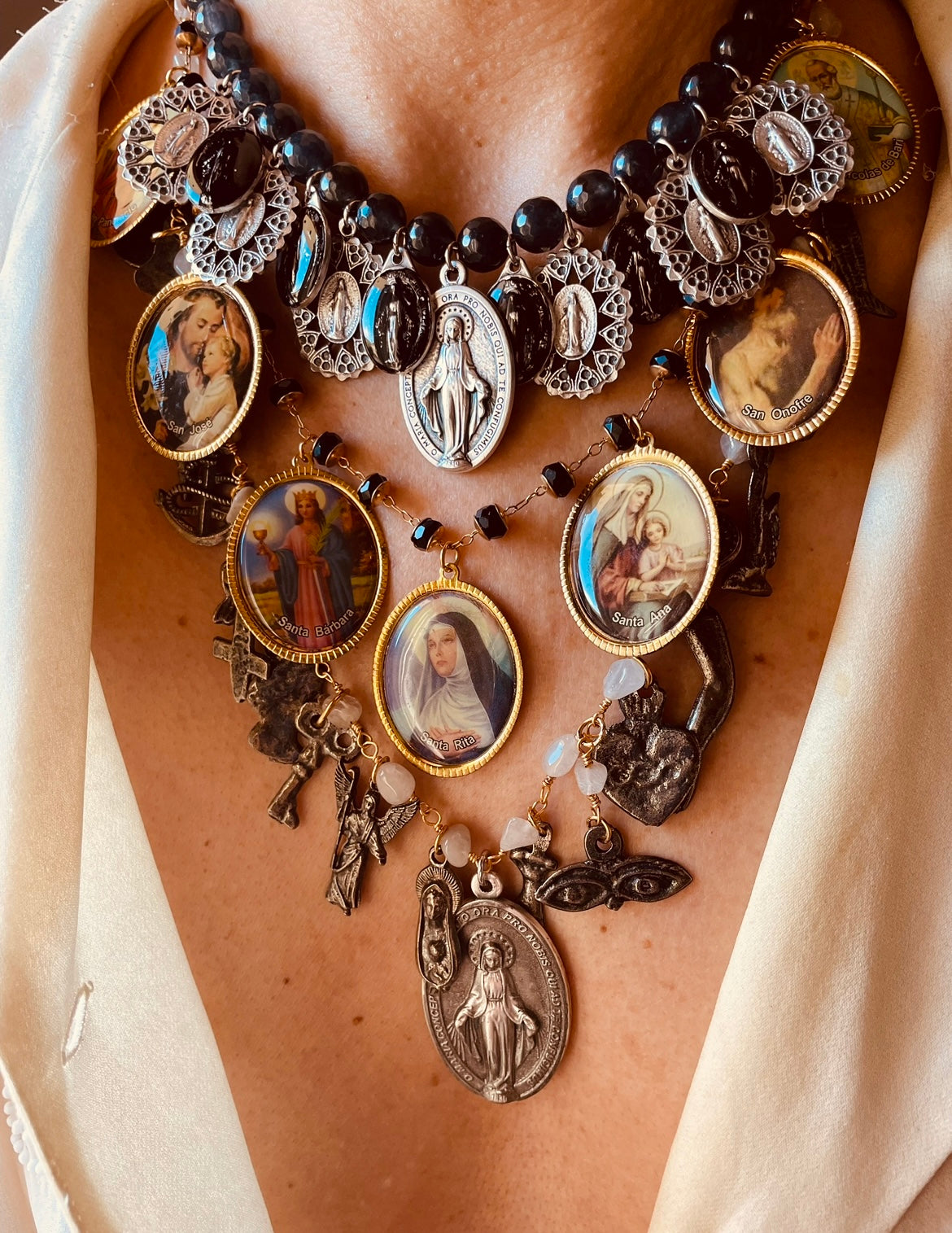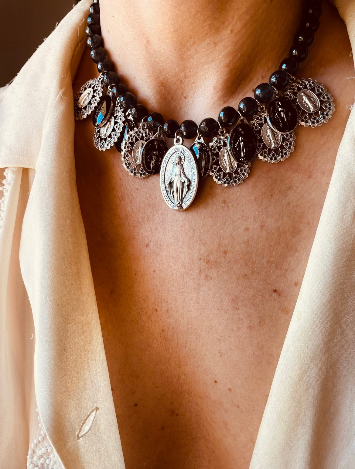 Ma il vero cuore sono le medaglie della Madonna Miracolosa. C’è quella centrale, importante e poi sei piccole opere d’arte dipinte a mano in nero che si alternano a una filigrana così delicata che sembra pizzo.