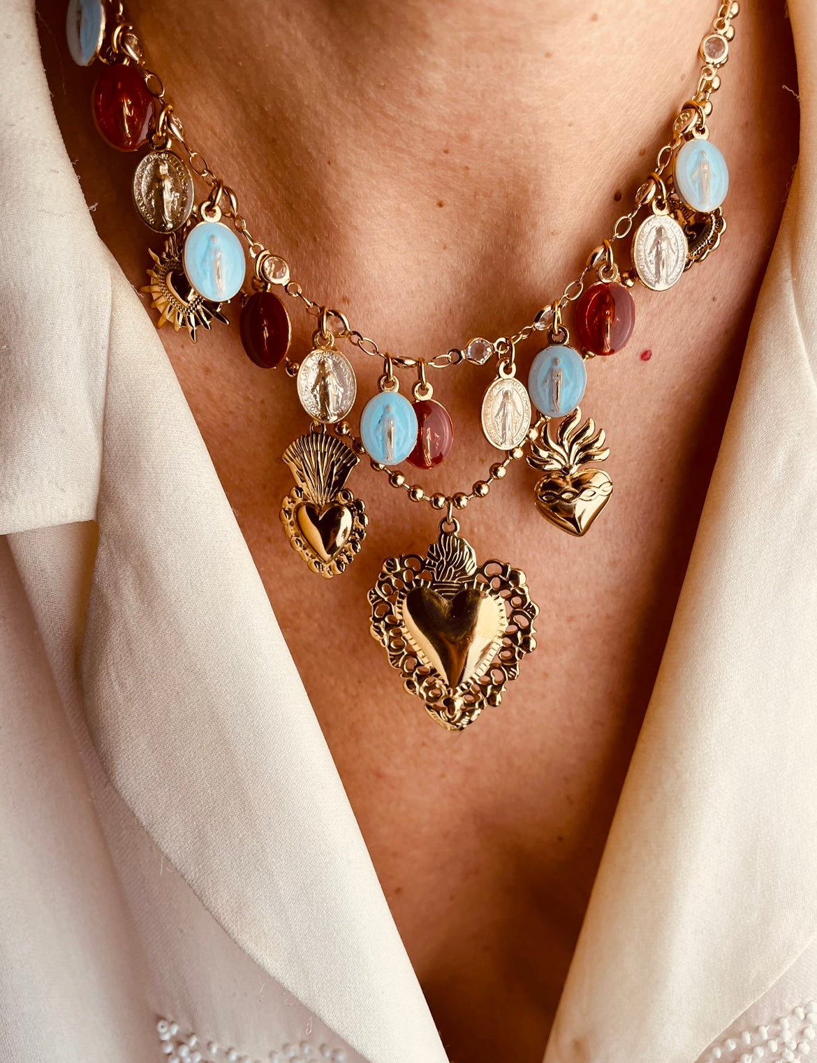 Questa collana riunisce quattro cuori sacri, ognuno con una sua voce: devozione, guarigione, protezione e gratitudine. Insieme creano un amuleto pensato per chi sente che l’energia del cuore non va solo indossata ma custodita.