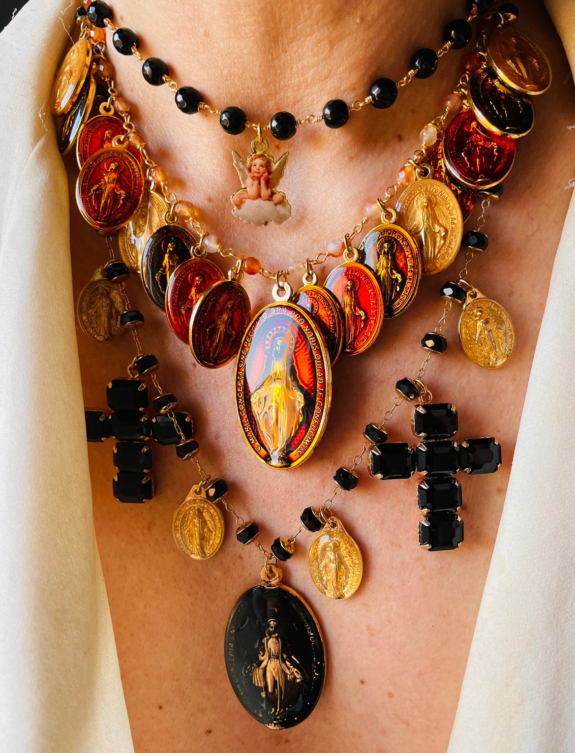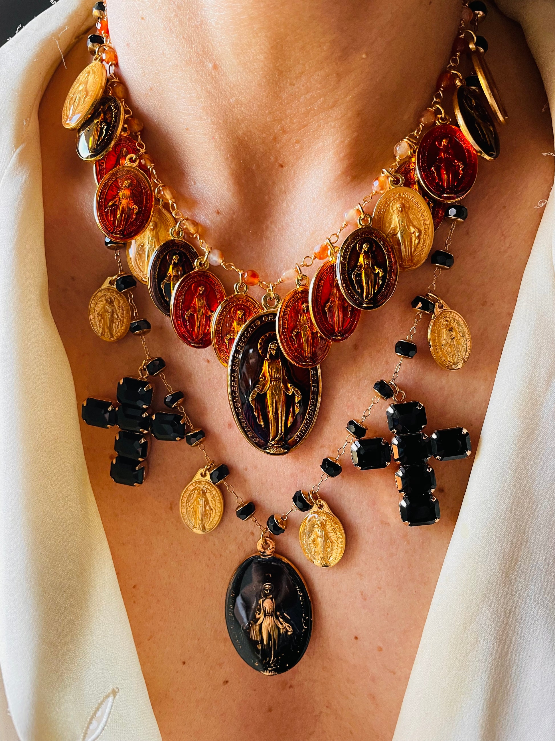 Collana in ottone e cristalli con pendagli in zama dipinti a mano e croci in rame e cristallo