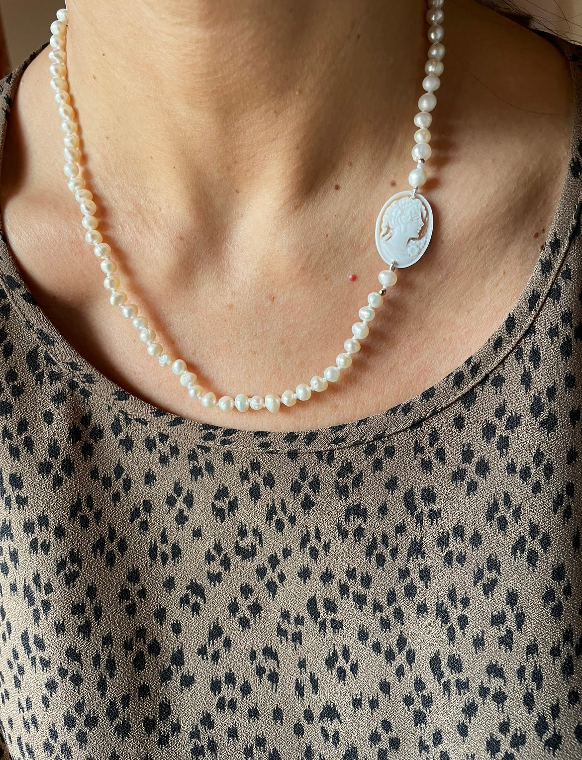 Questa no: il suo equilibrio si sposta di lato, dove un piccolo cammeo autentico si posa come un pensiero gentile, leggermente fuori dalle regole.