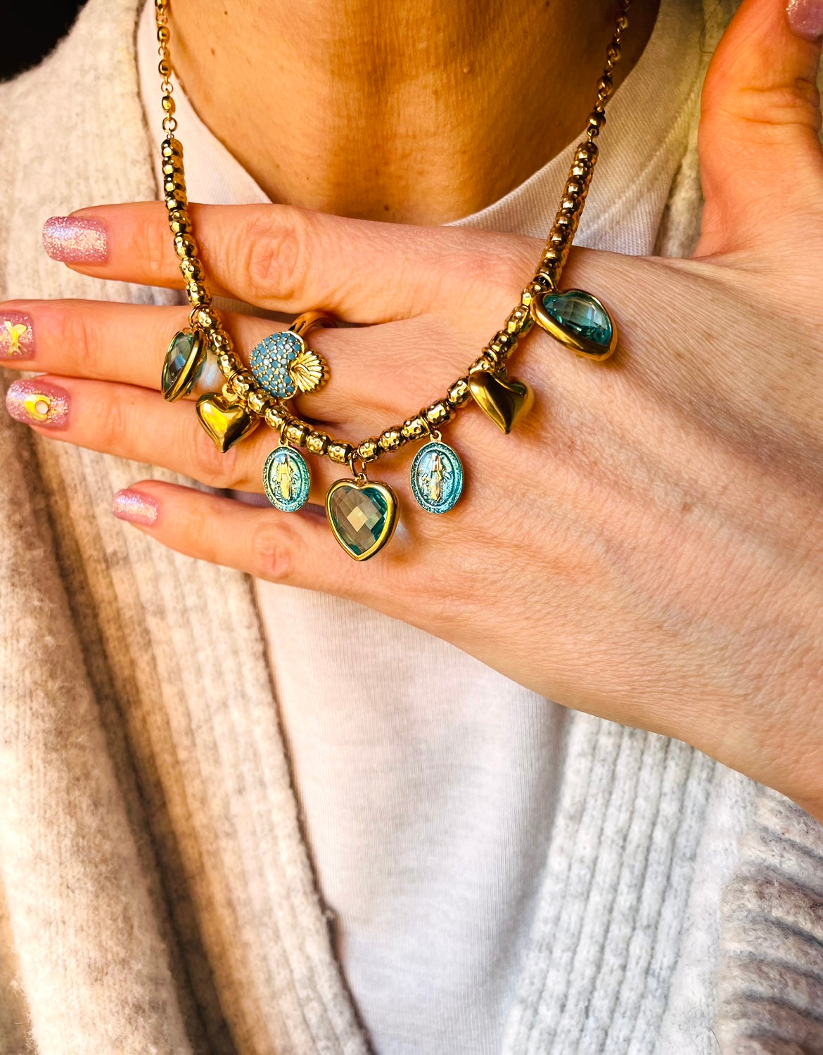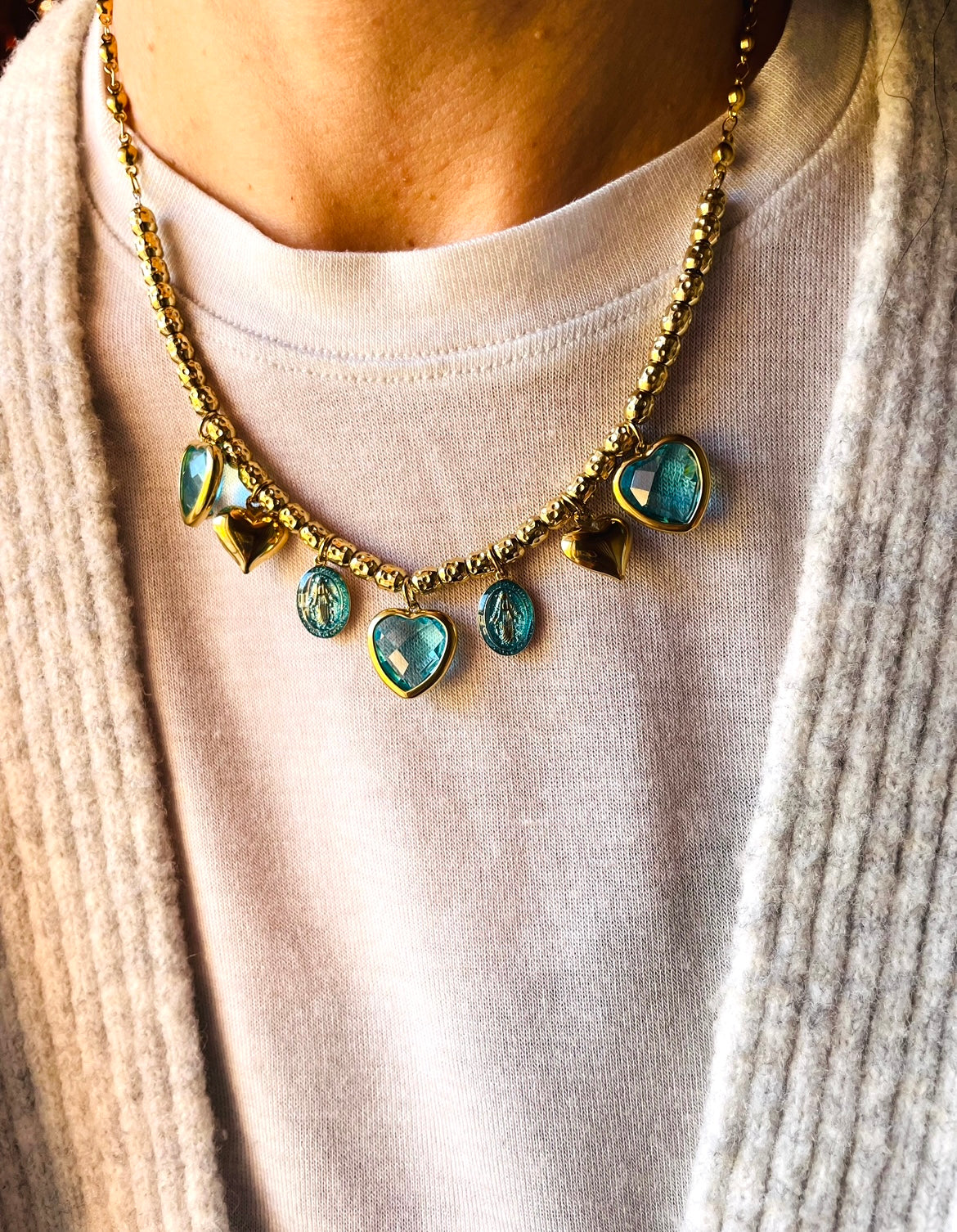 Chocker composto da granelli che terminano con una catenina a bolle nella parte finale,pendagli a forma di cuore e madonnine dipinte a mano.
