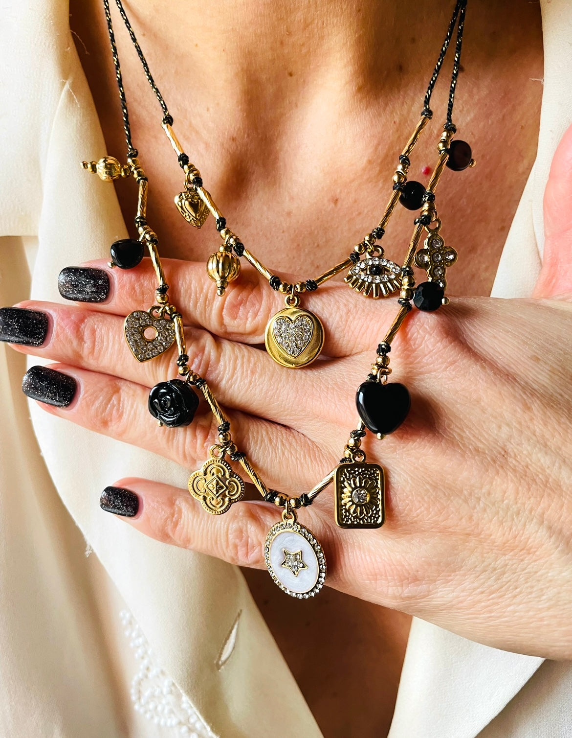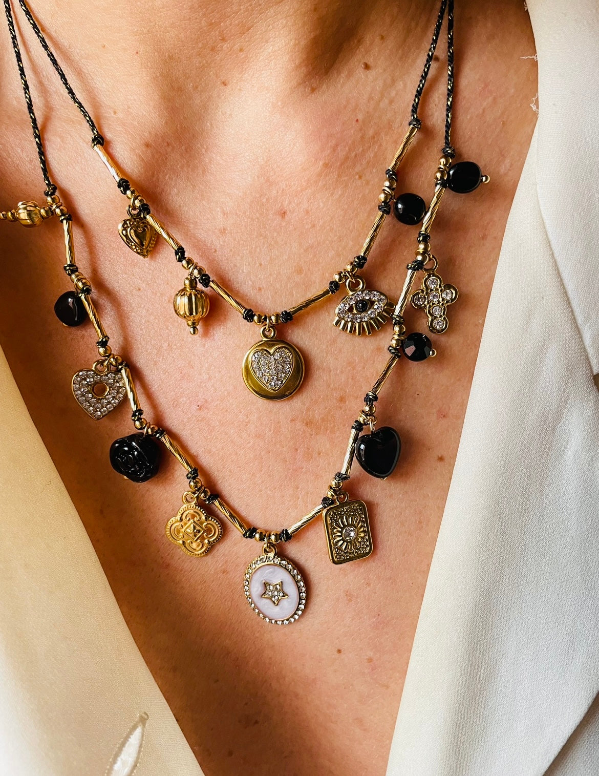La collana Doppia Fortuna è l'espressione di un'eleganza misteriosa e potente. Il design è studiato per catturare l'attenzione: due fili in cotone nero e oro si uniscono per creare un effetto a doppio strato ricco e sofisticato.