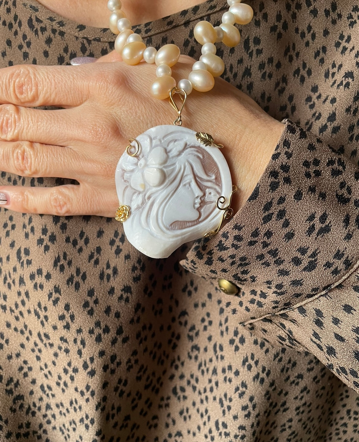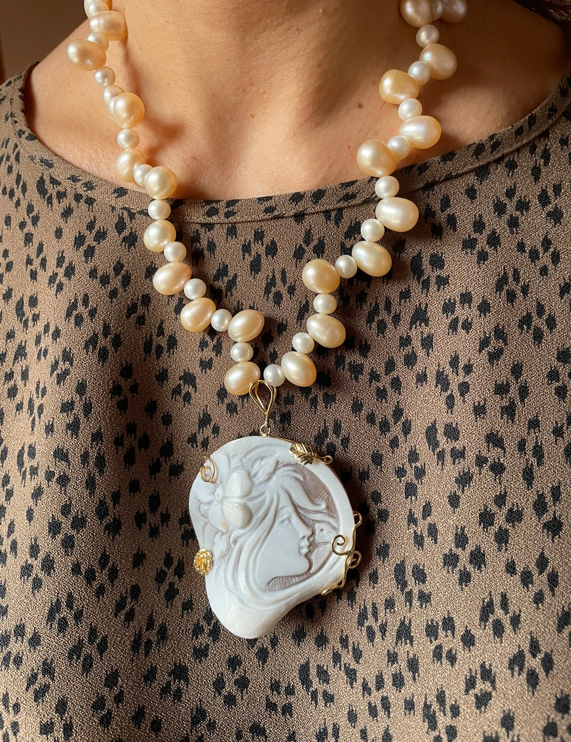 Il cammeo in conchiglia di sardonica è incastonato in una filigrana d’argento che sembra scolpita dal tempo, mentre le perle di fiume,bianche e rosate,si alternano come due respiri diversi della stessa eleganza.