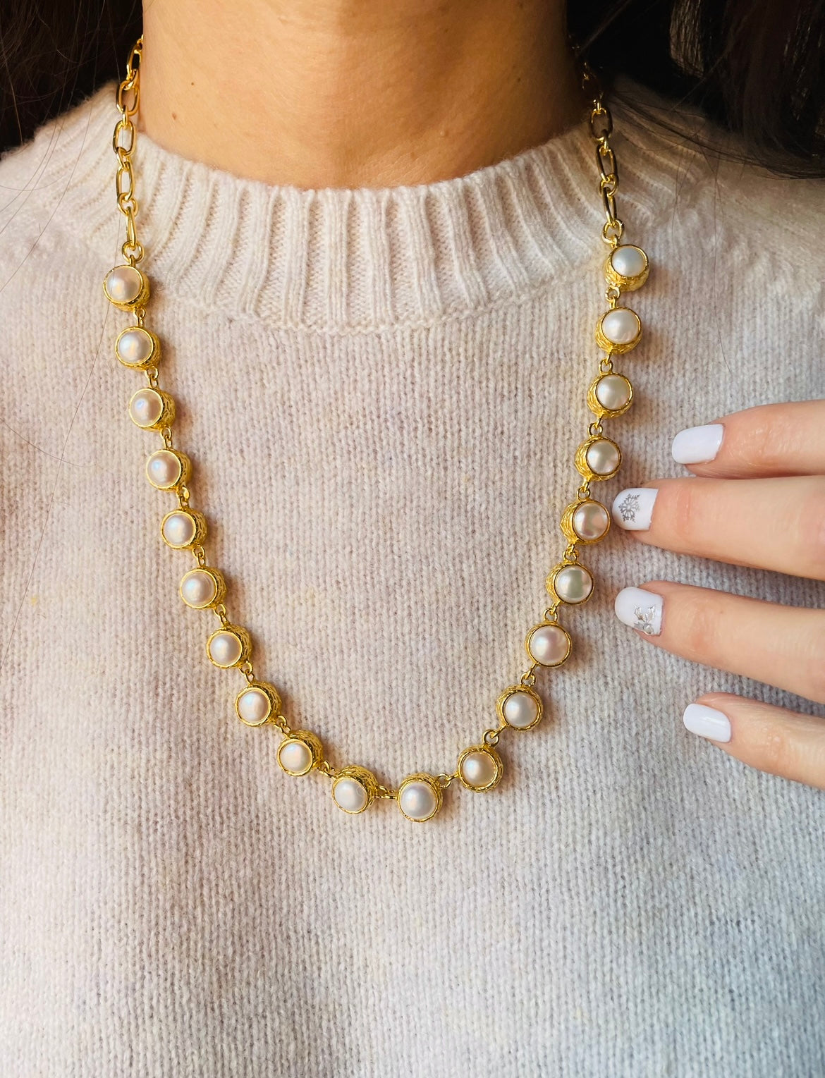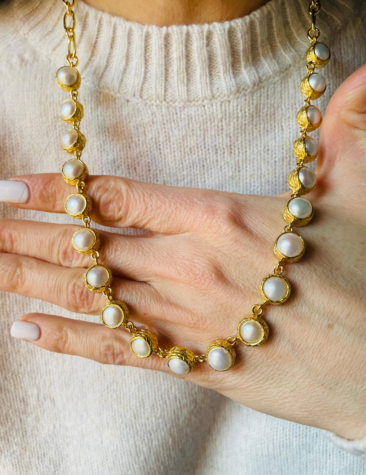 Avvolgi il tuo stile in una scia di luce senza tempo con questa creazione esclusiva, dove la purezza della vera madreperla incontra il calore tattile dell'ottone placcato oro.