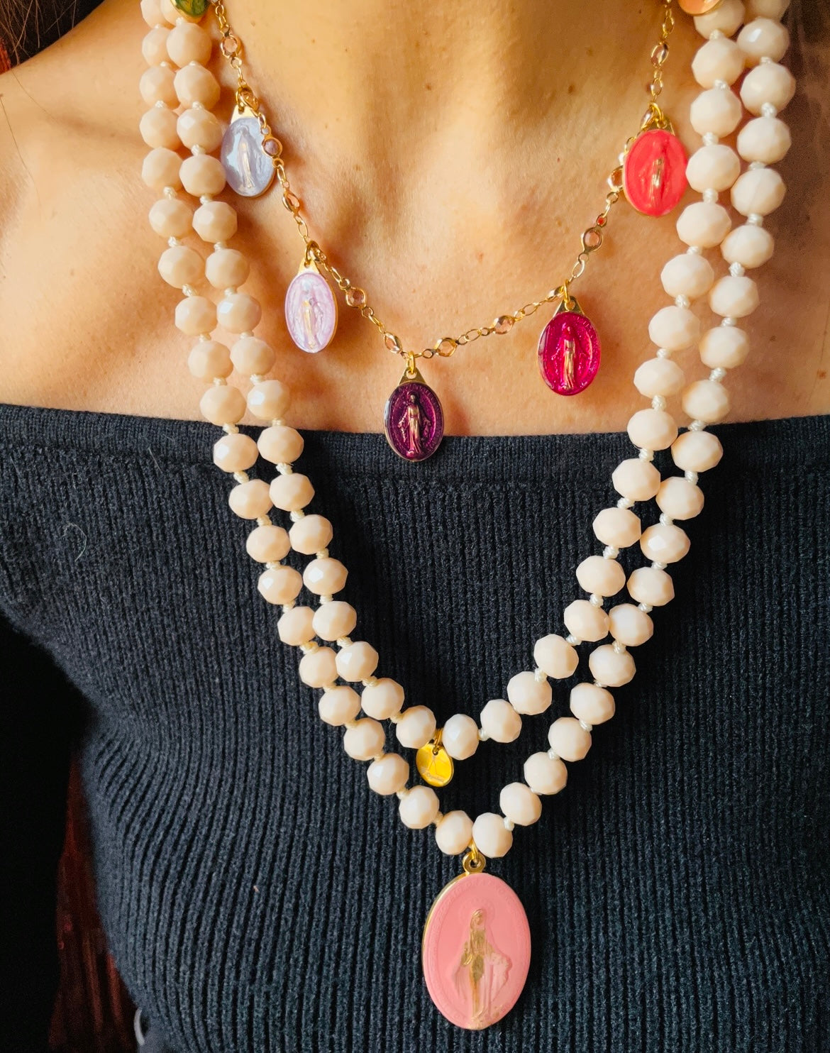 Le medaglie miracolose, tutte diverse e vivaci nei colori, diventano un piccolo arcobaleno da indossare: danno energia positiva, regalano buon umore e allo stesso tempo custodiscono un significato profondo di protezione.