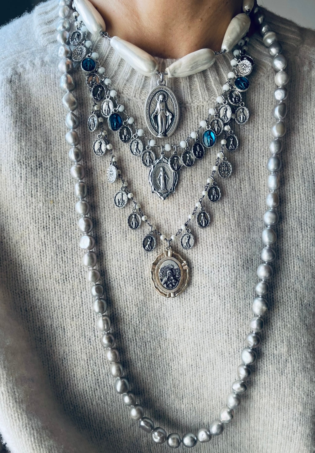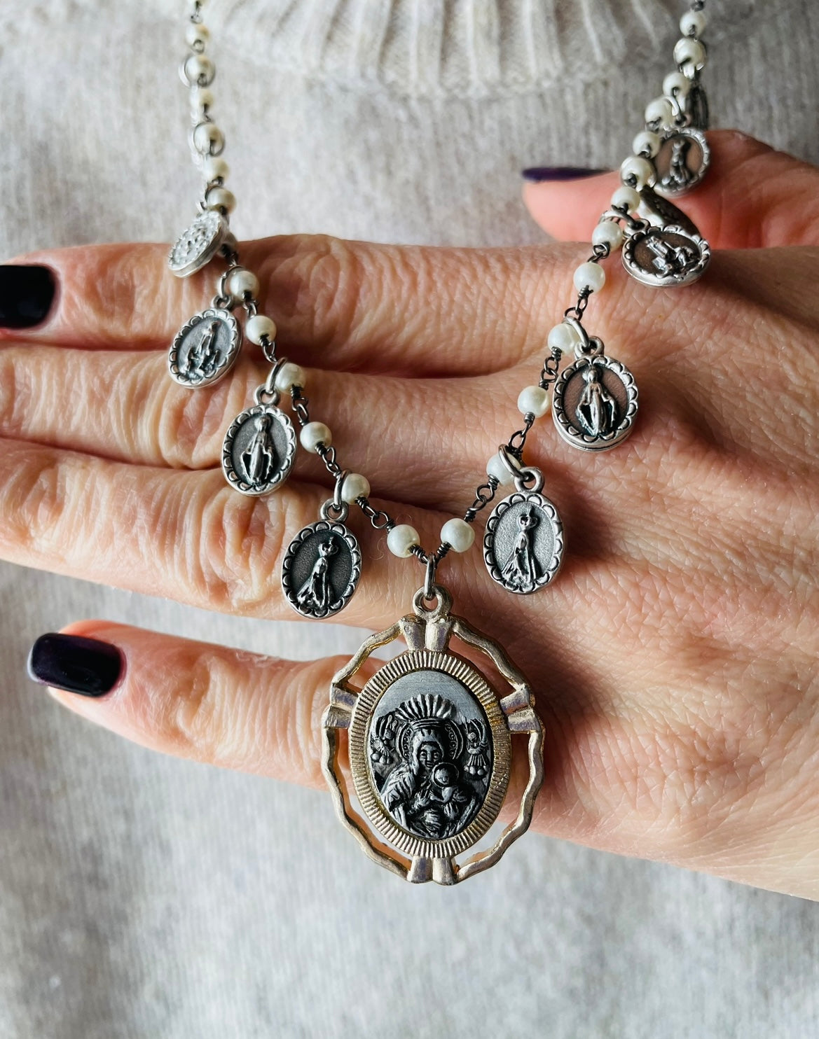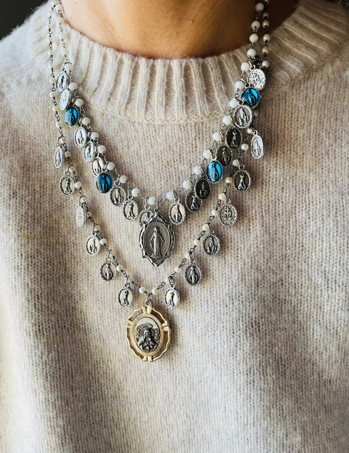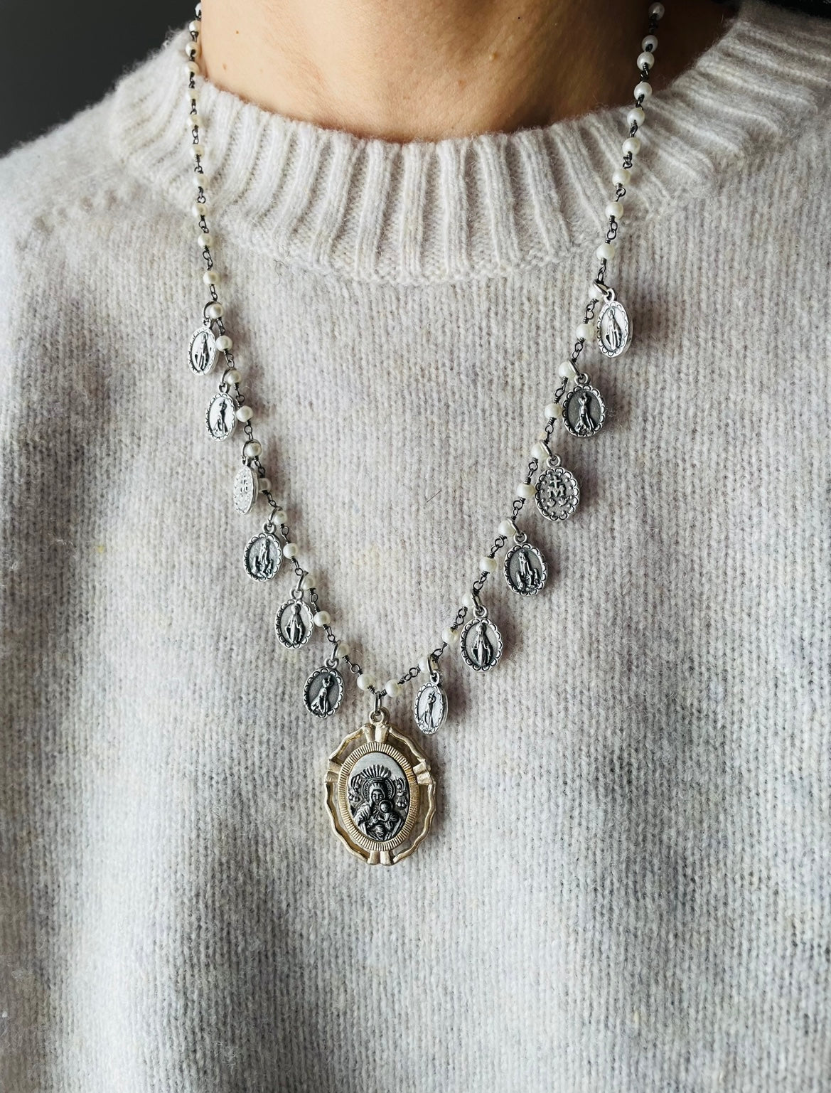 Questa è la medaglia al centro di tutto. Intorno a lei, le medagliette votive vintage della Medaglia Miracolosa e della Madonna di Fatima si muovono come in una processione ferma, ognuna con la propria storia e la propria preghiera. Parigi 1830. Fatima 1917. Creta, fine del Quattrocento. Tre apparizioni, tre secoli diversi, un filo solo.