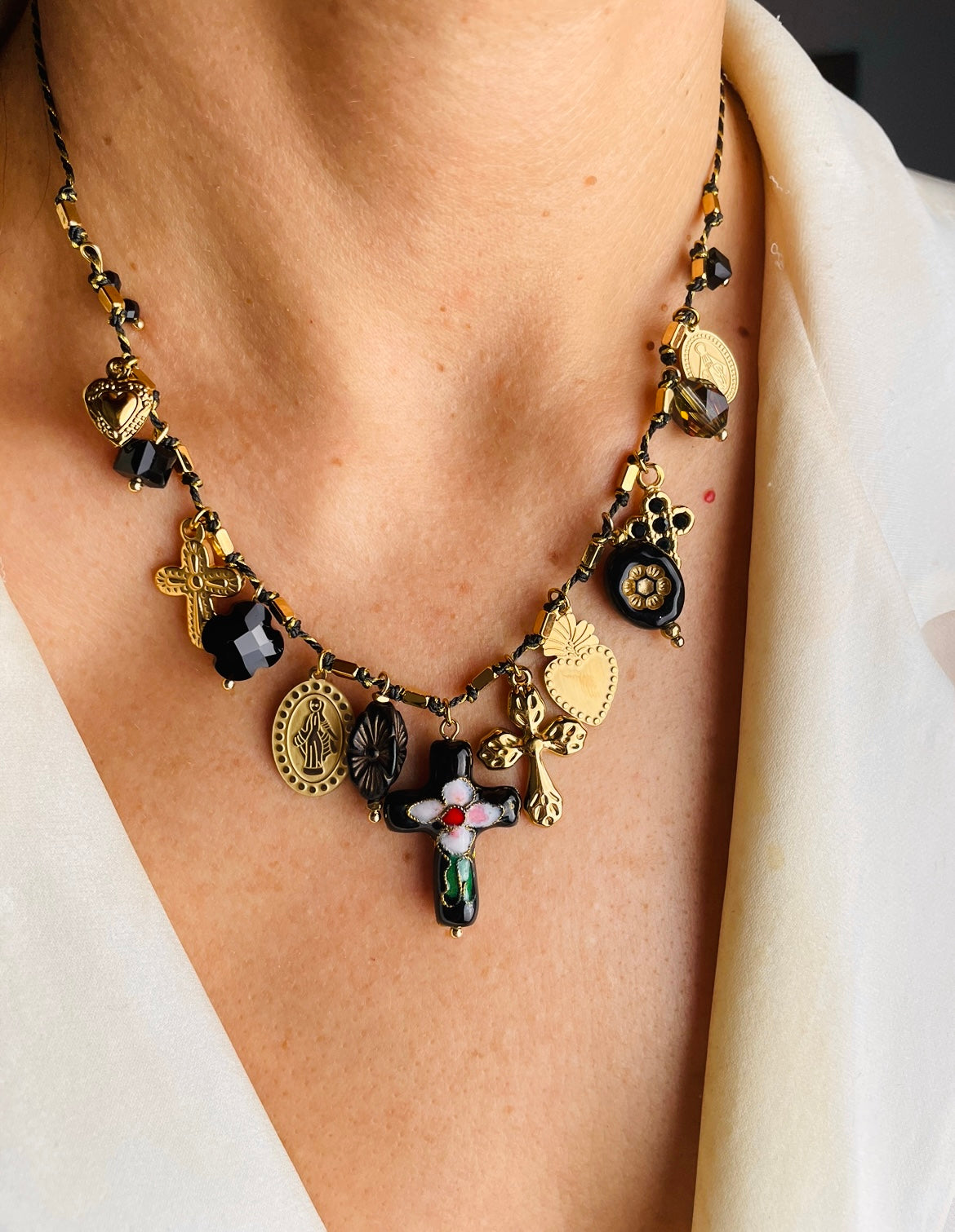 Una collana nata per chi sente che i simboli, quando si uniscono, fanno compagnia. Il filo nero è intrecciato con un filo dorato che aggiunge luce.
