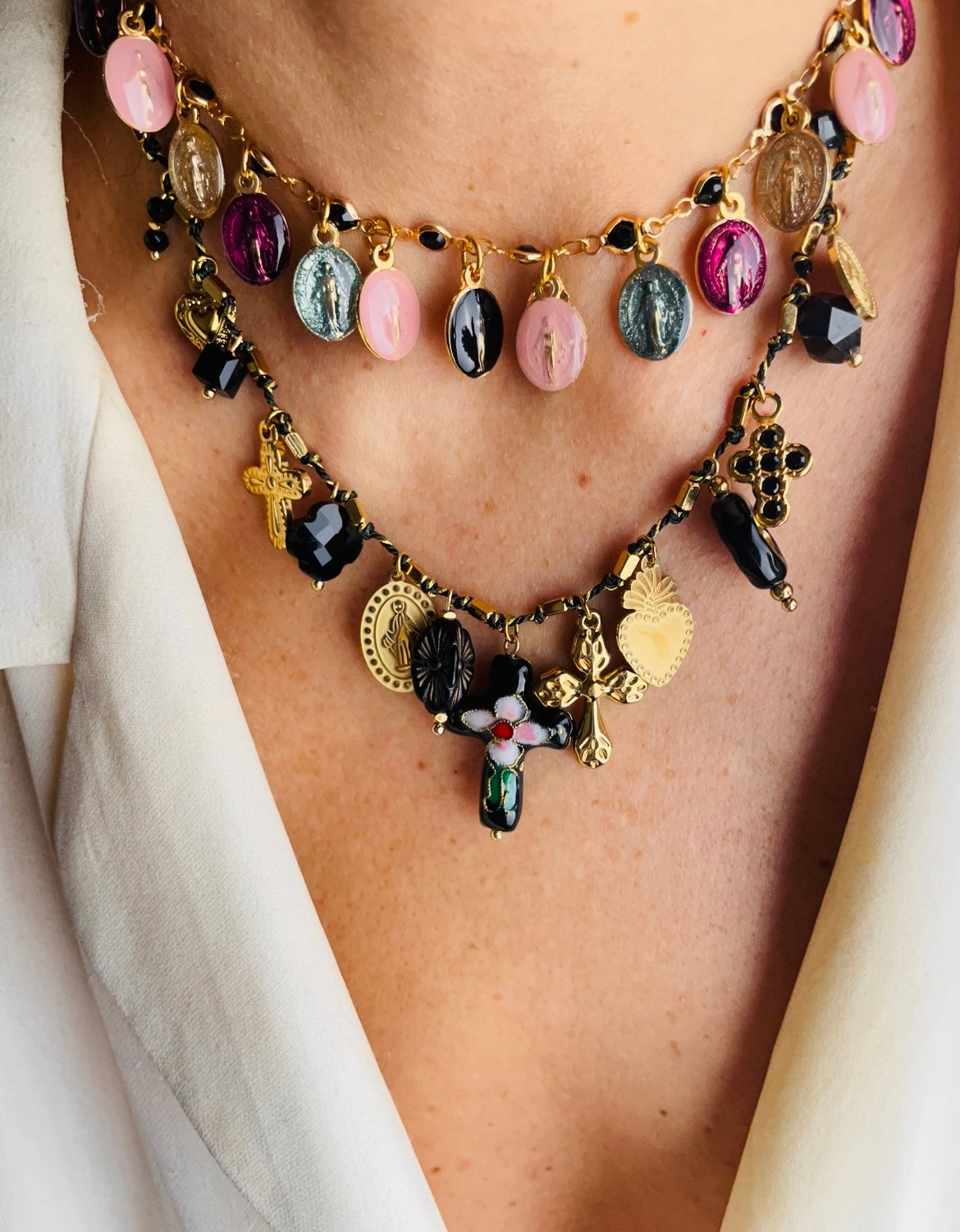 Ogni nodo accoglie un pendaglio scelto per custodire un’intenzione: il Cuore Sacro, la Madonnina, la Croce.