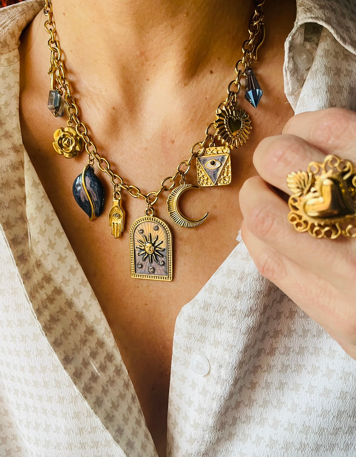 Il centro a cupola raffigura un sole in cui ogni raggio ha un brillantino che crea un punto luce deciso. Attorno si alternano pendenti portafortuna: la mano, l’occhio greco, la mezzaluna e il cornetto.