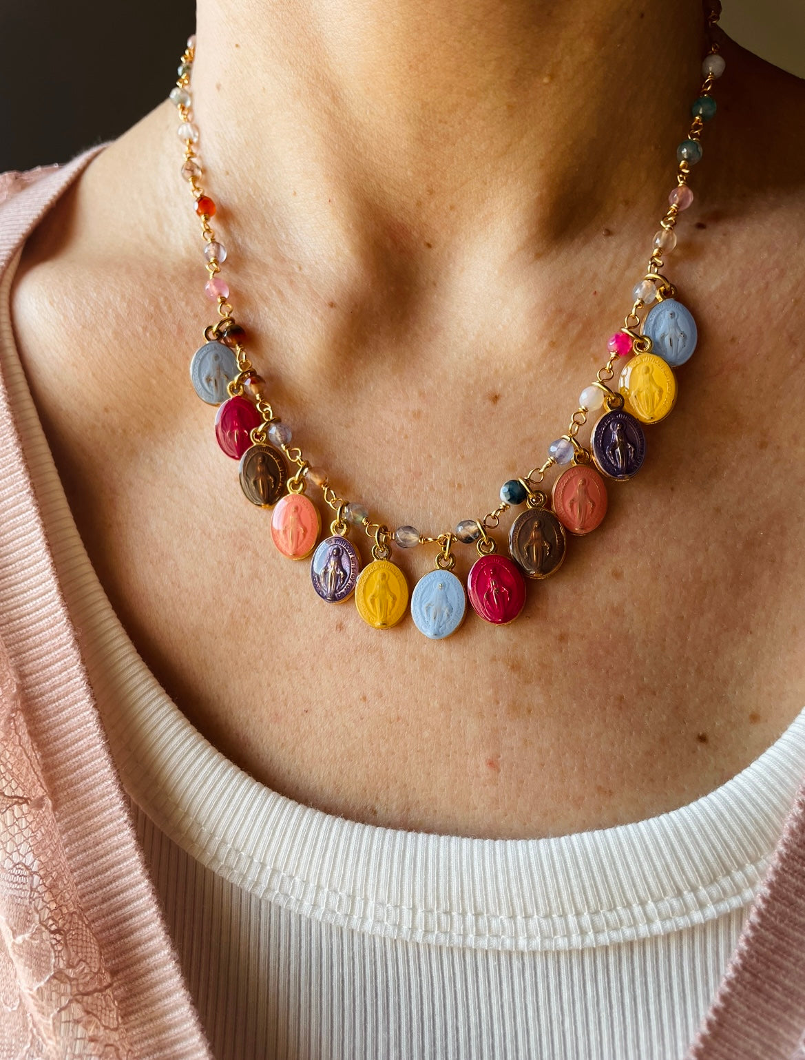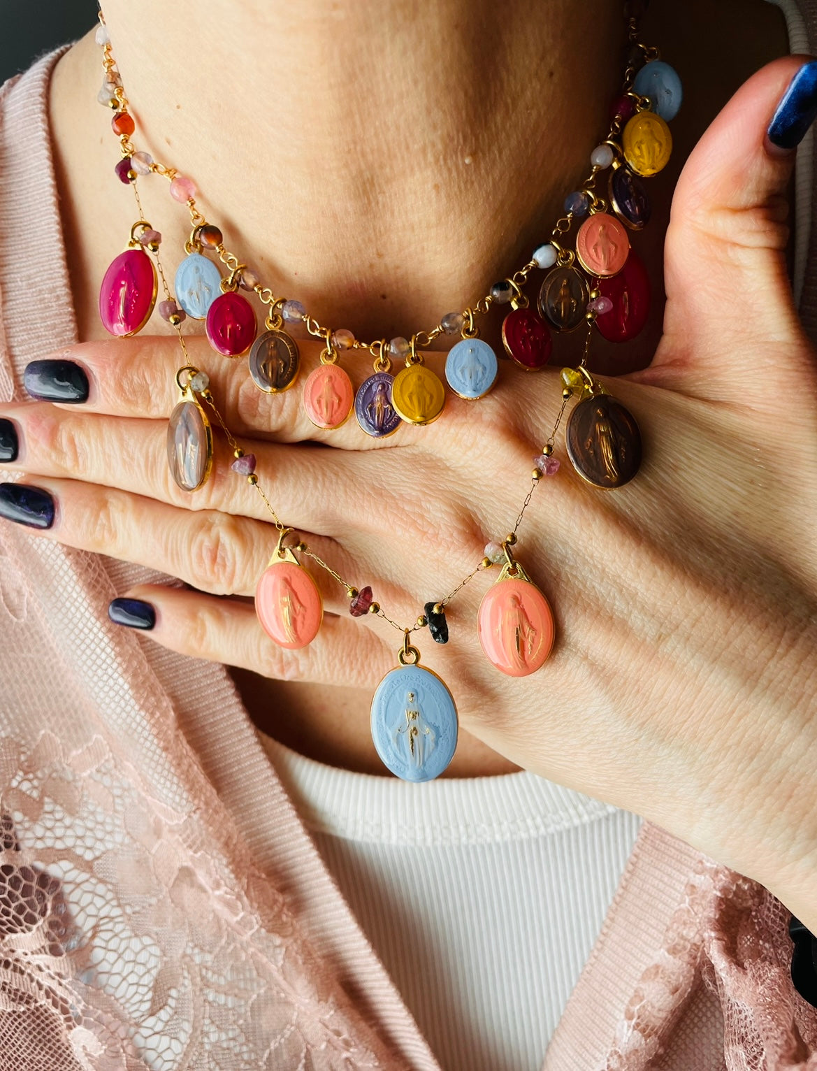 La collana Pantone 2026 nasce da quella stessa intuizione. Le medaglie dipinte a mano raffiguranti Madonne devozionali dalla grazia antica e silenziosa indossano esattamente le tonalità che il Pantone Color Institute ha dichiarato colori dell’anno 2026.