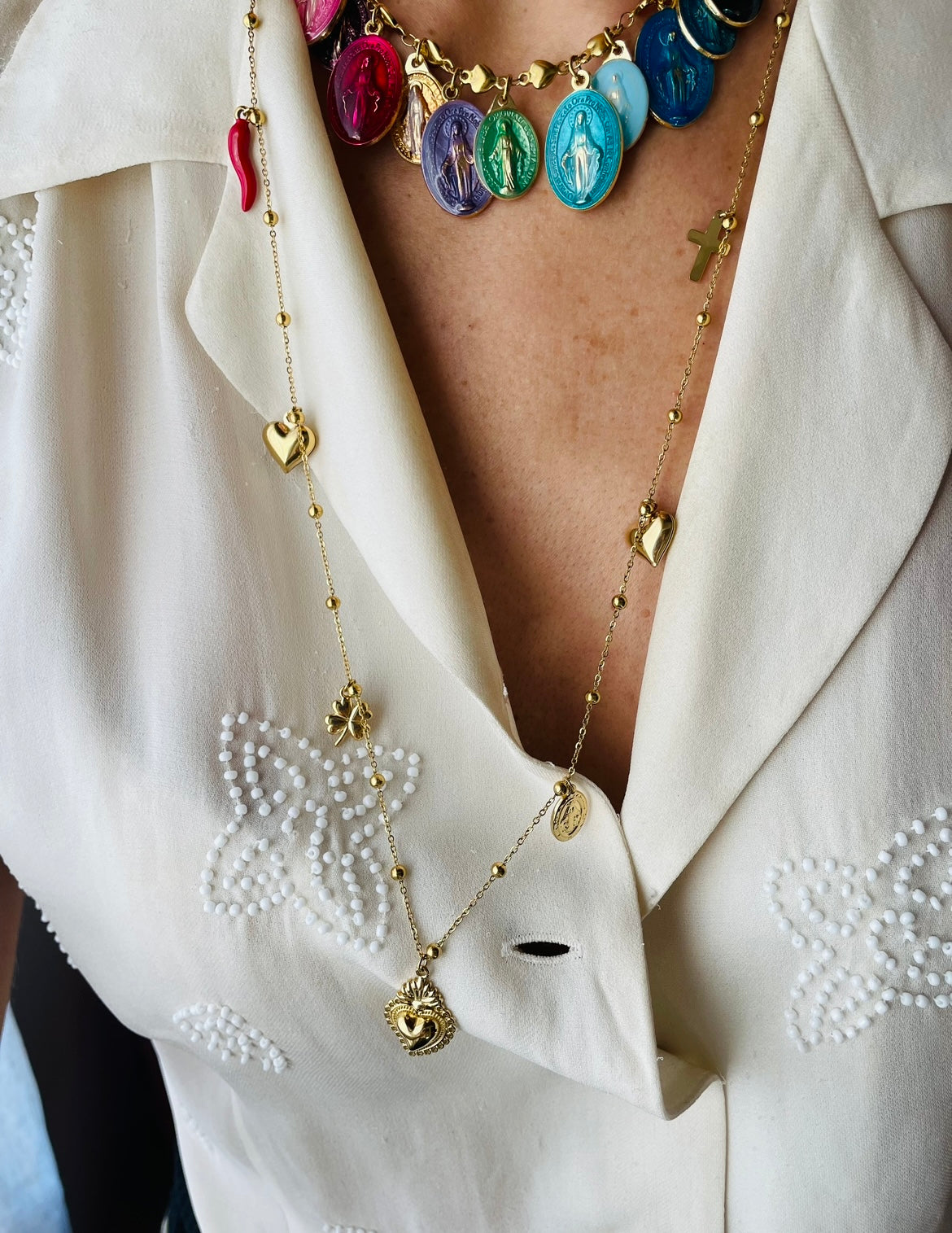 La catena è costellata di piccoli talismani in acciaio inossidabile: crocifisso, Madonnina, cuore sacro quadrifoglio,peperoncino. Un piccolo universo di simboli beneauguranti!