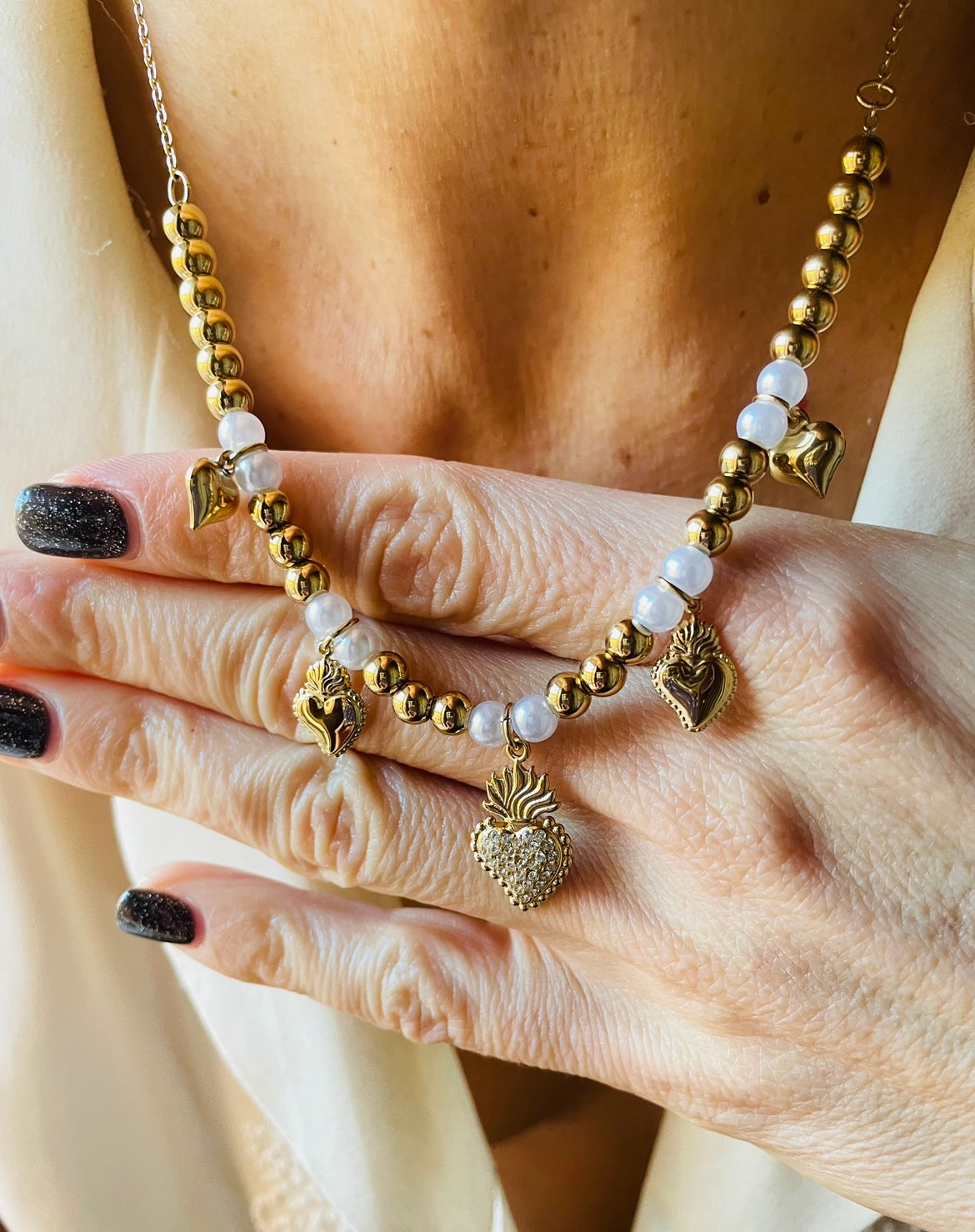 Collana in acciaio inossidabile composta da perline bianche sintetiche, perline in acciaio dorato e cuoricini sacri.