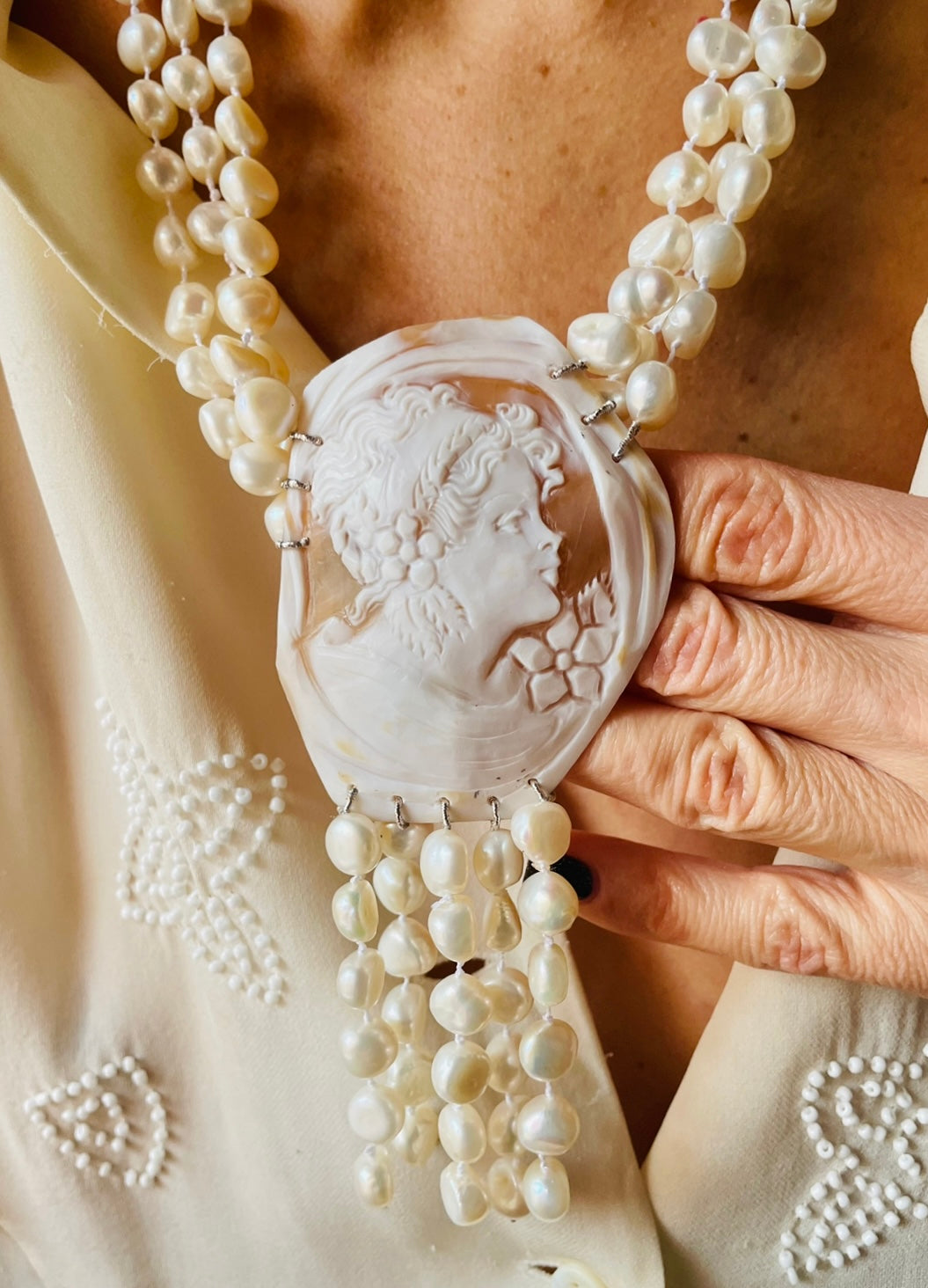 Il grande cammeo centrale è sostenuto da tre fili di perle di fiume bianche che ne esaltano la presenza con un equilibrio naturale.