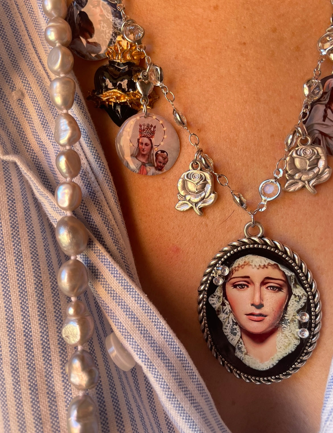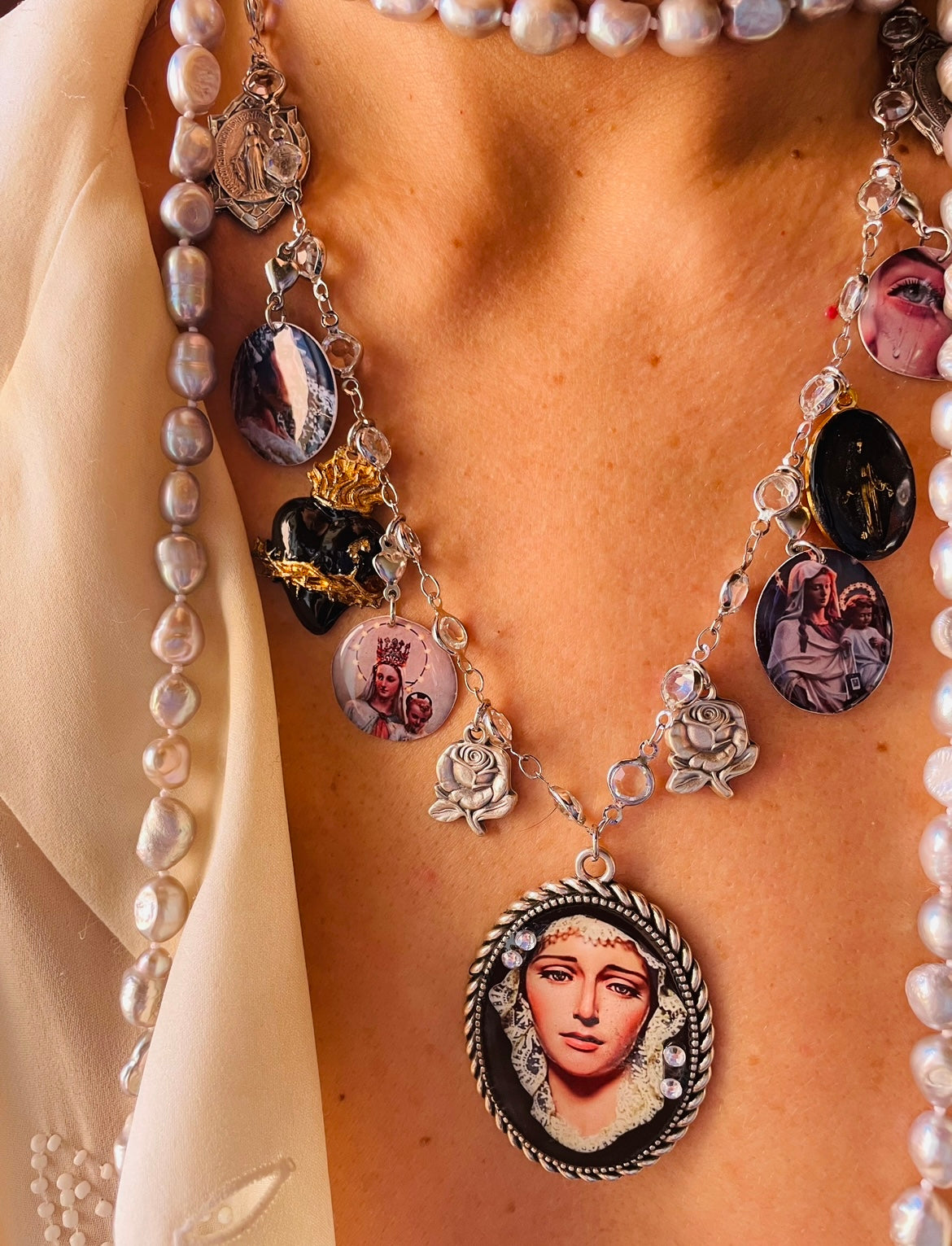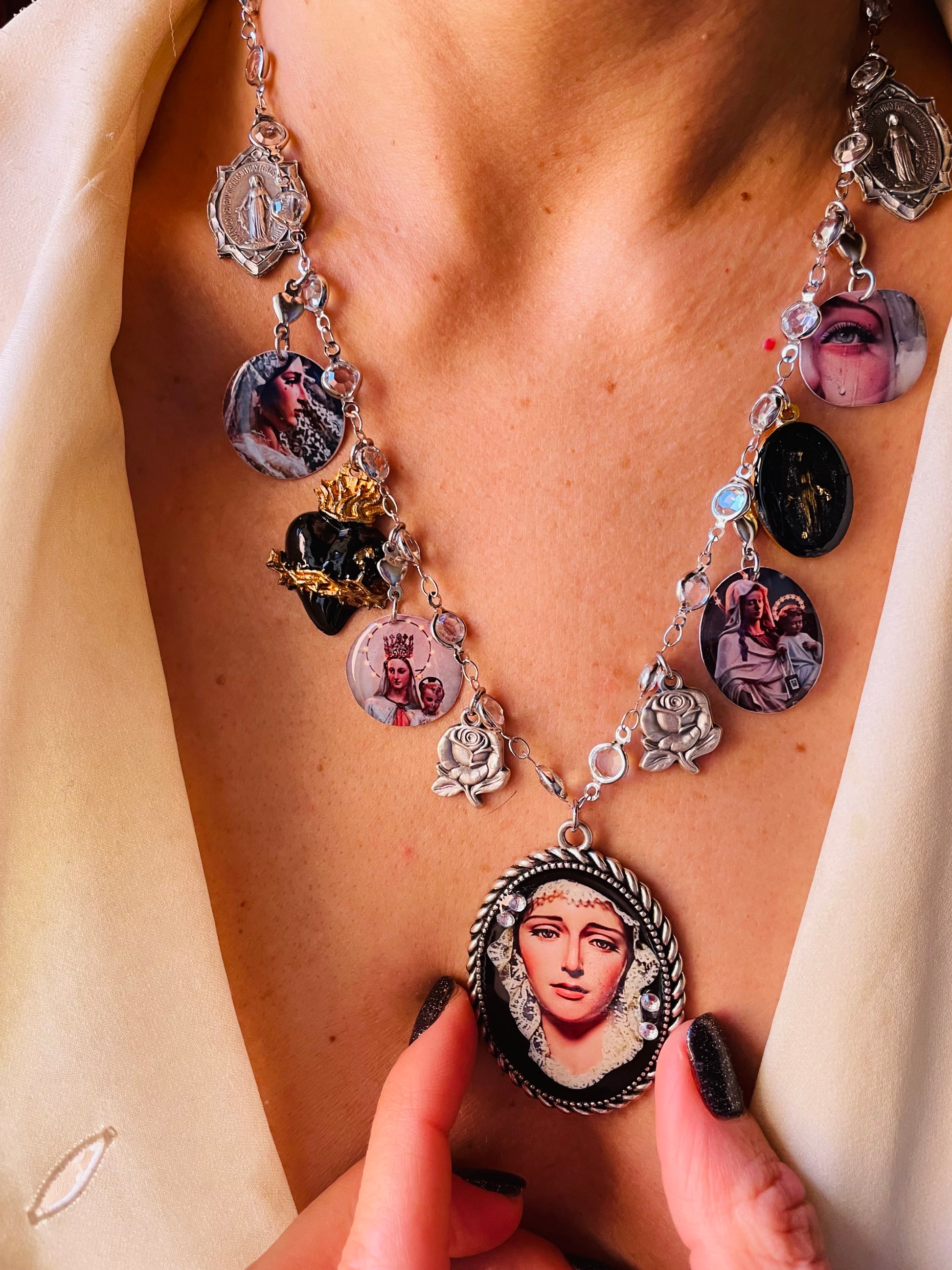 Ogni pendaglio è scelto per risvegliare una parte di te: la Madonna piangente che invita alla sensibilità profonda, la Madonnina dipinta a mano che illumina con dolcezza, il cuore sacro che ho realizzato personalmente e la rosa, simbolo eterno della Madre.