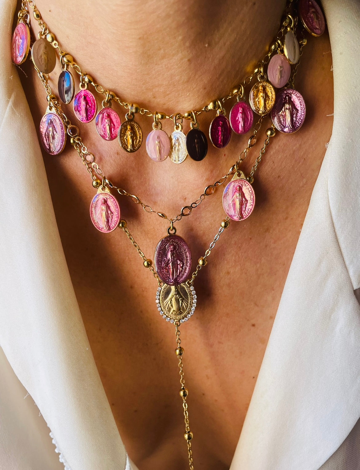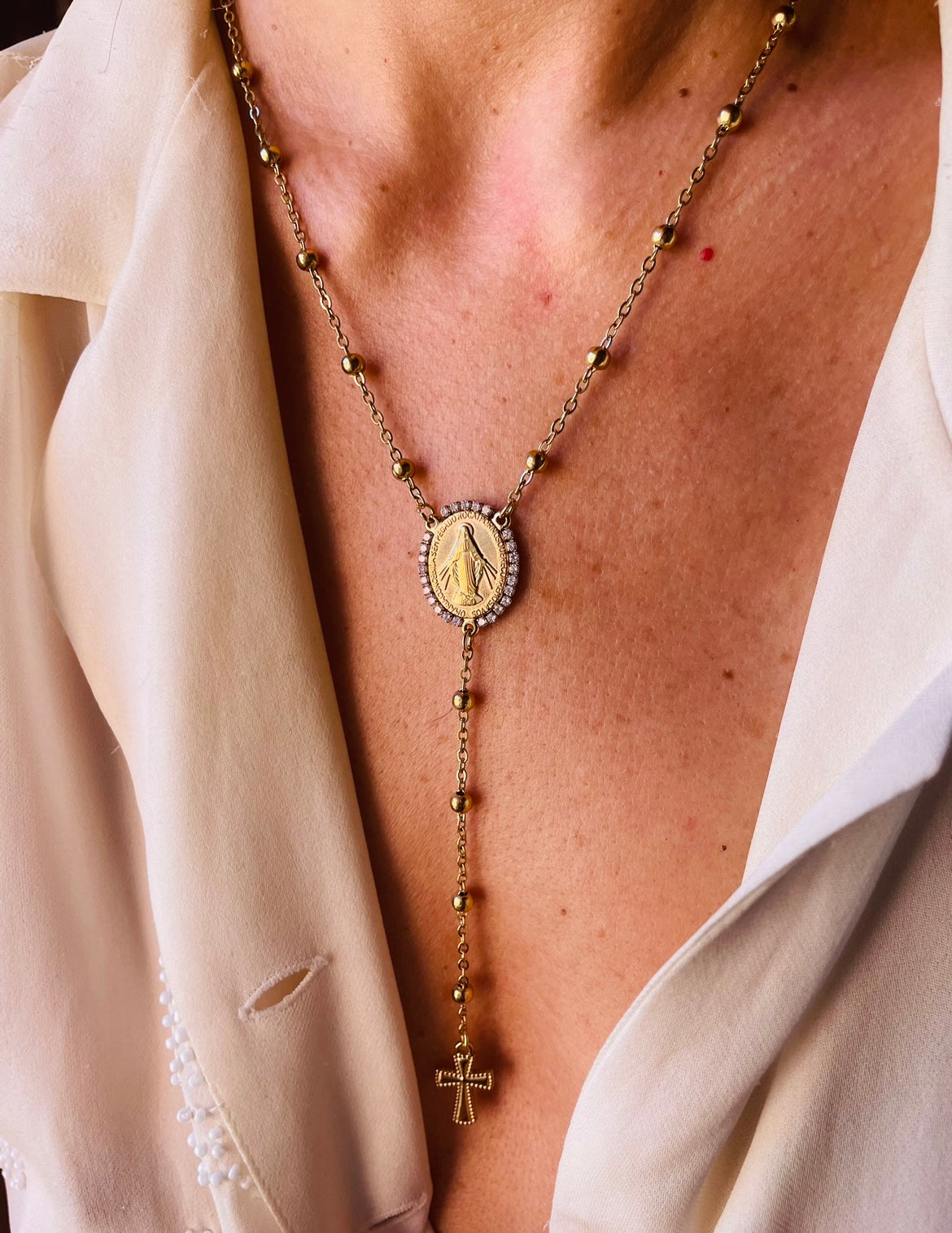 Al centro, la Madonna Miracolosa risplende in una medaglia incorniciata da zirconi luminosi, come se la luce stessa la avvolgesse
