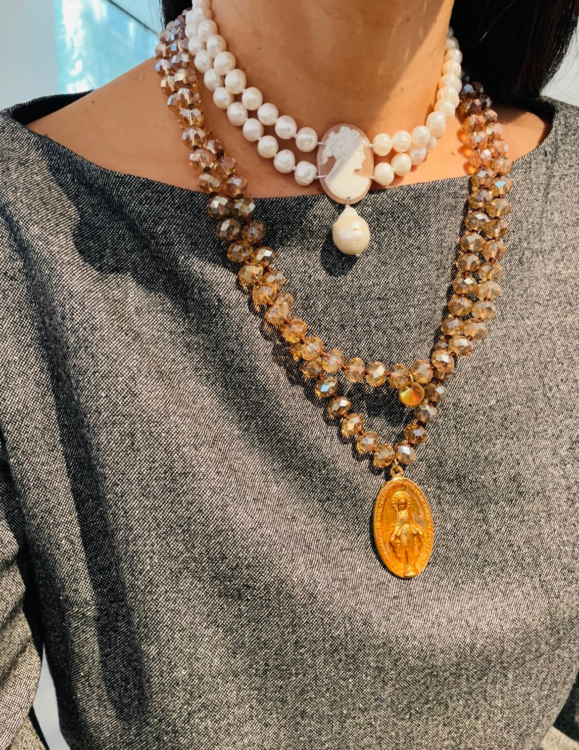 Un filo prezioso di cristalli colorati che culmina al centro con la Medaglia della Madonna Miracolosa.