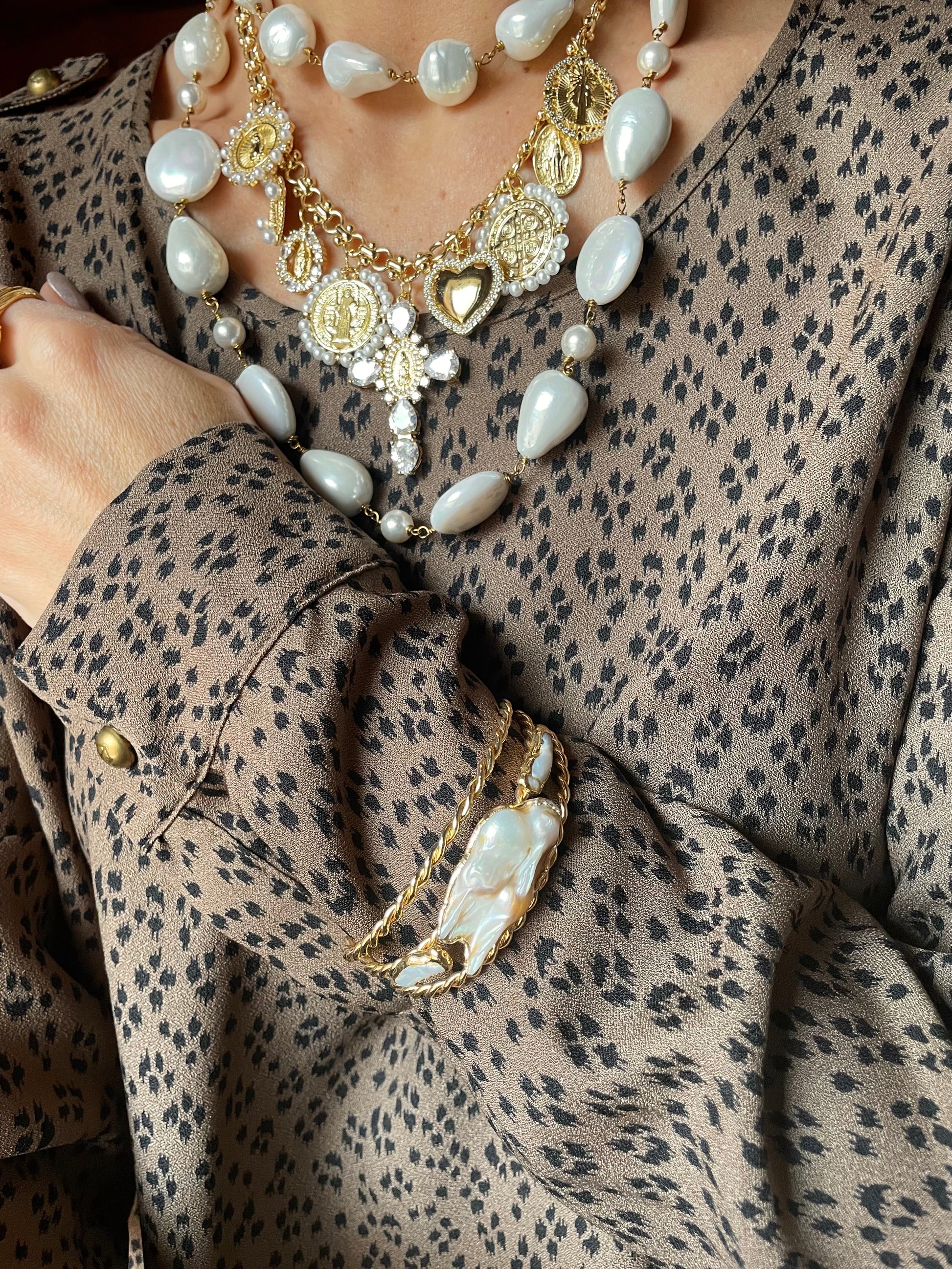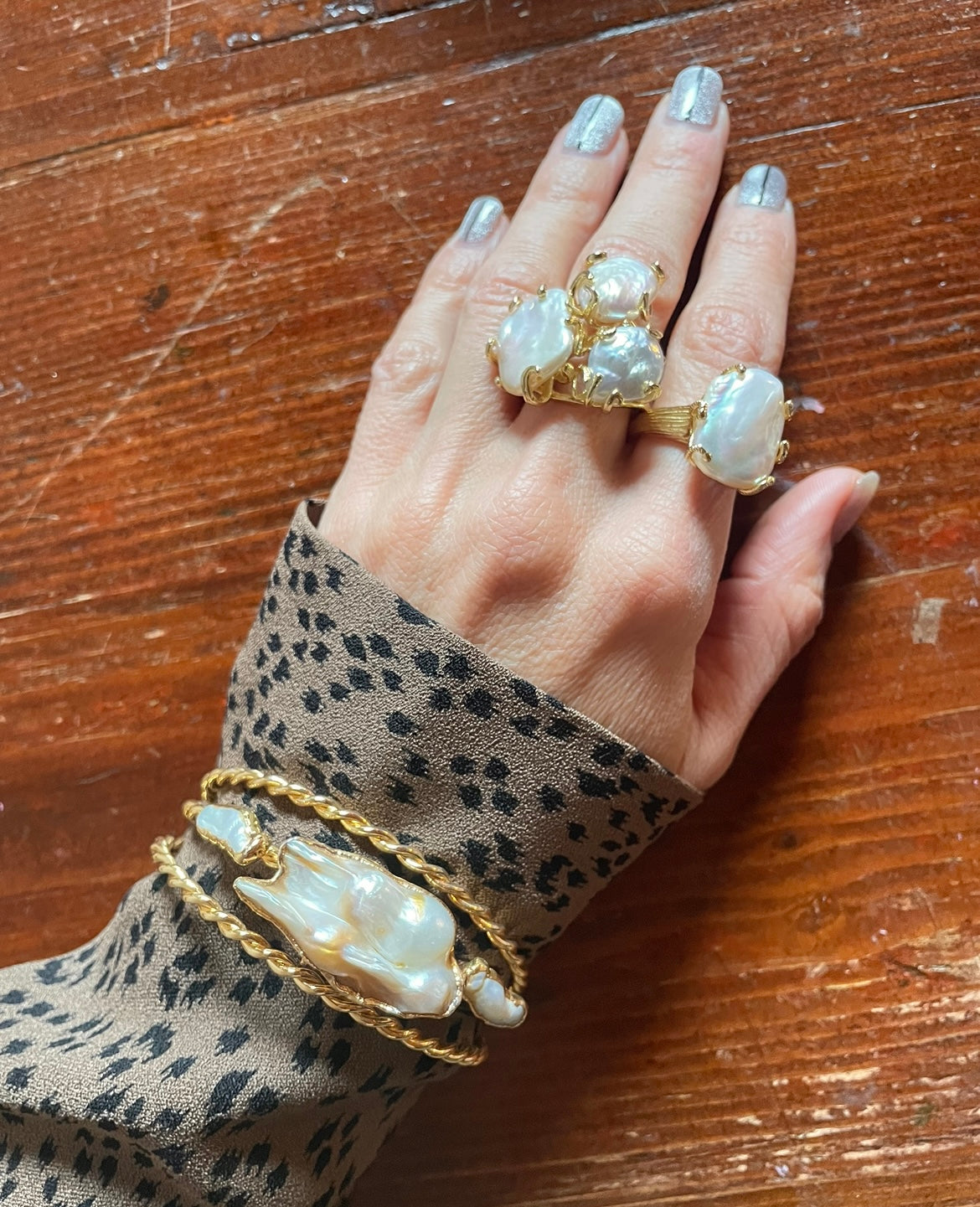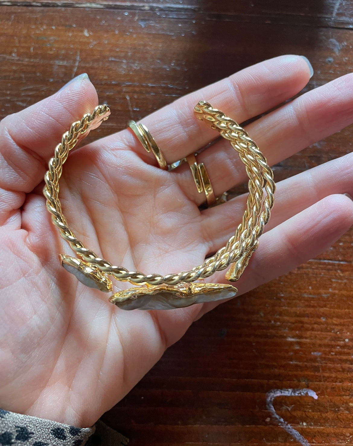 Questo bracciale nasce dall’incontro tra luce e materia: tre linee d’ottone placcato oro si avvolgono l’una sull’altra come a cercarsi, al centro una madreperla che cattura ogni sfumatura del giorno