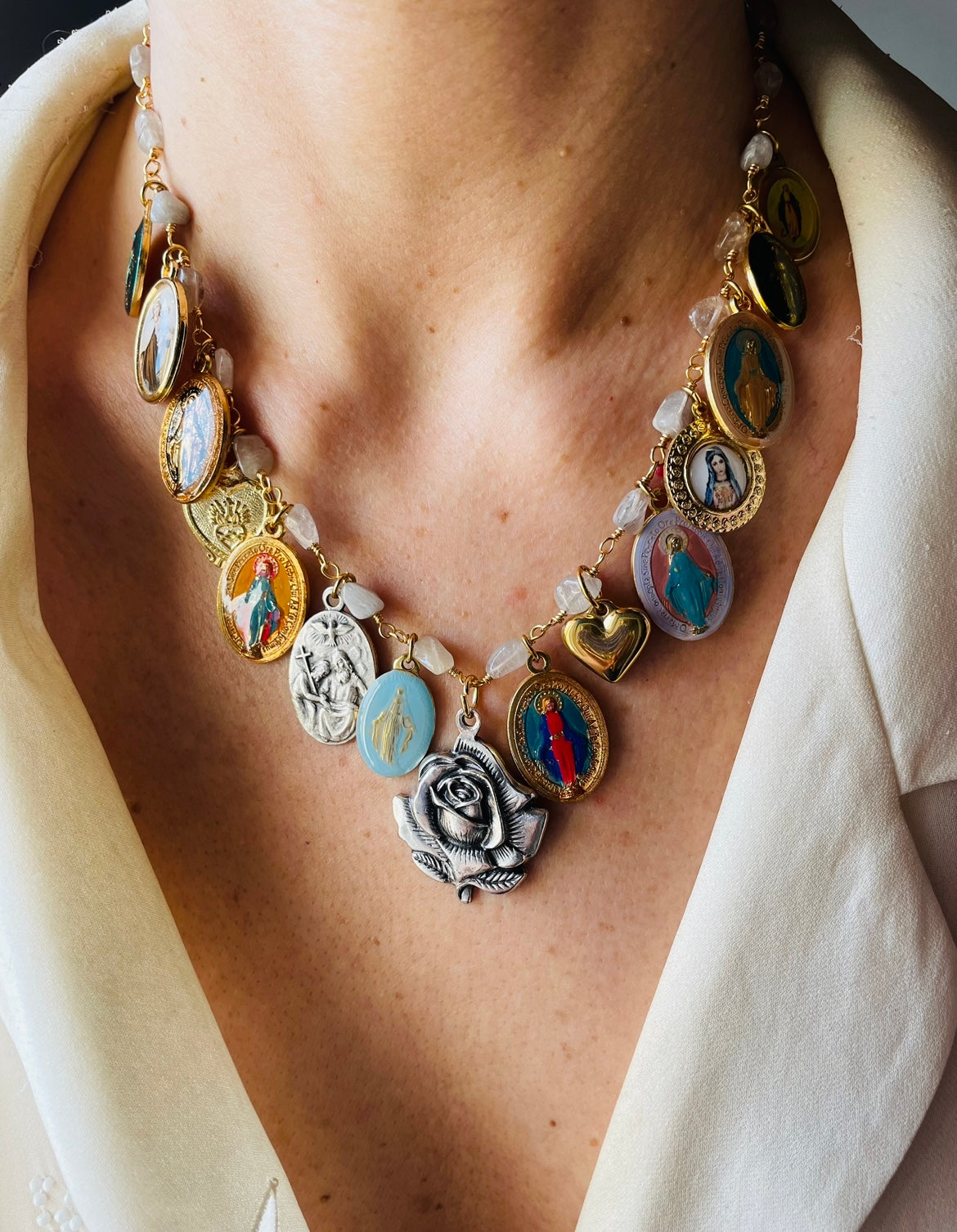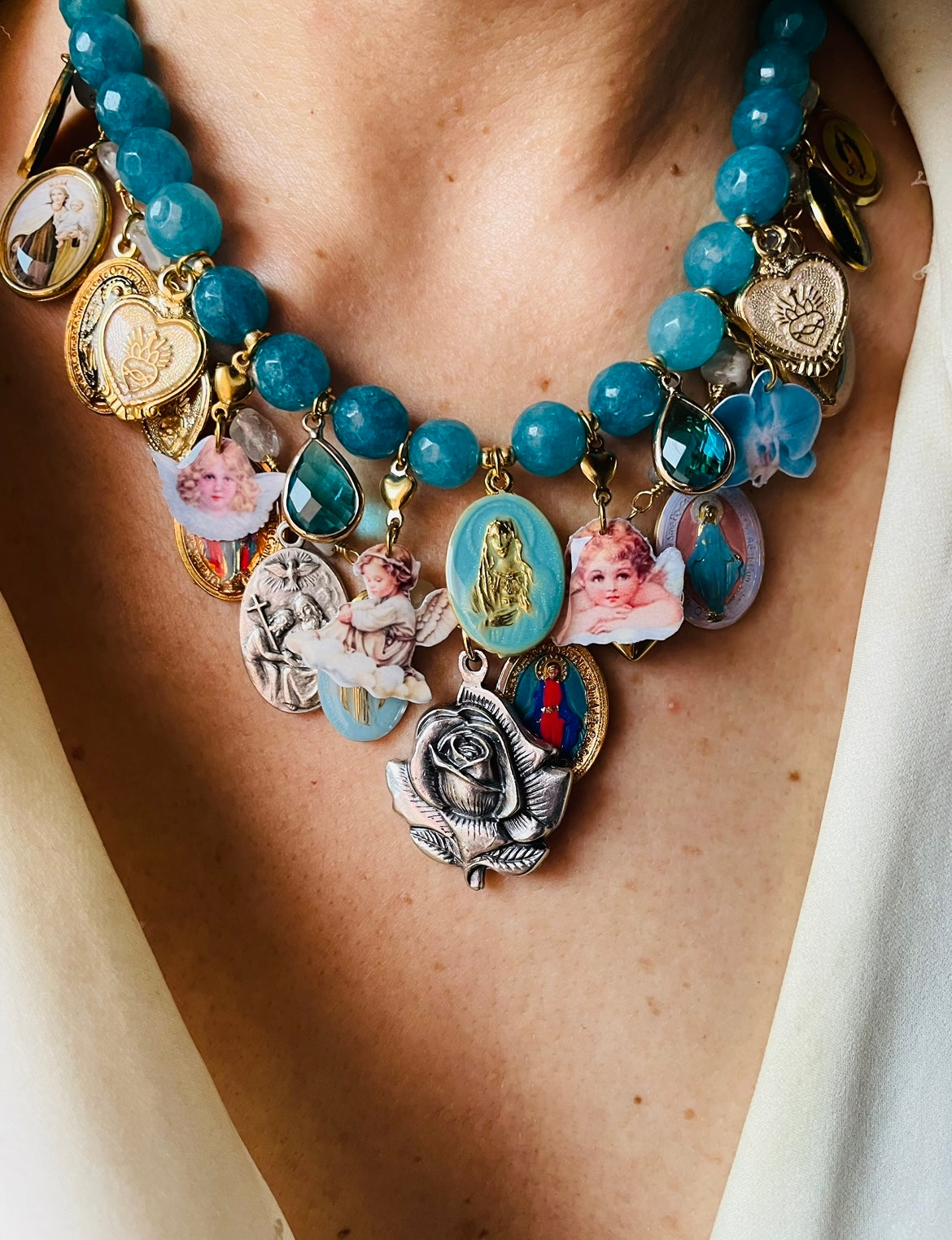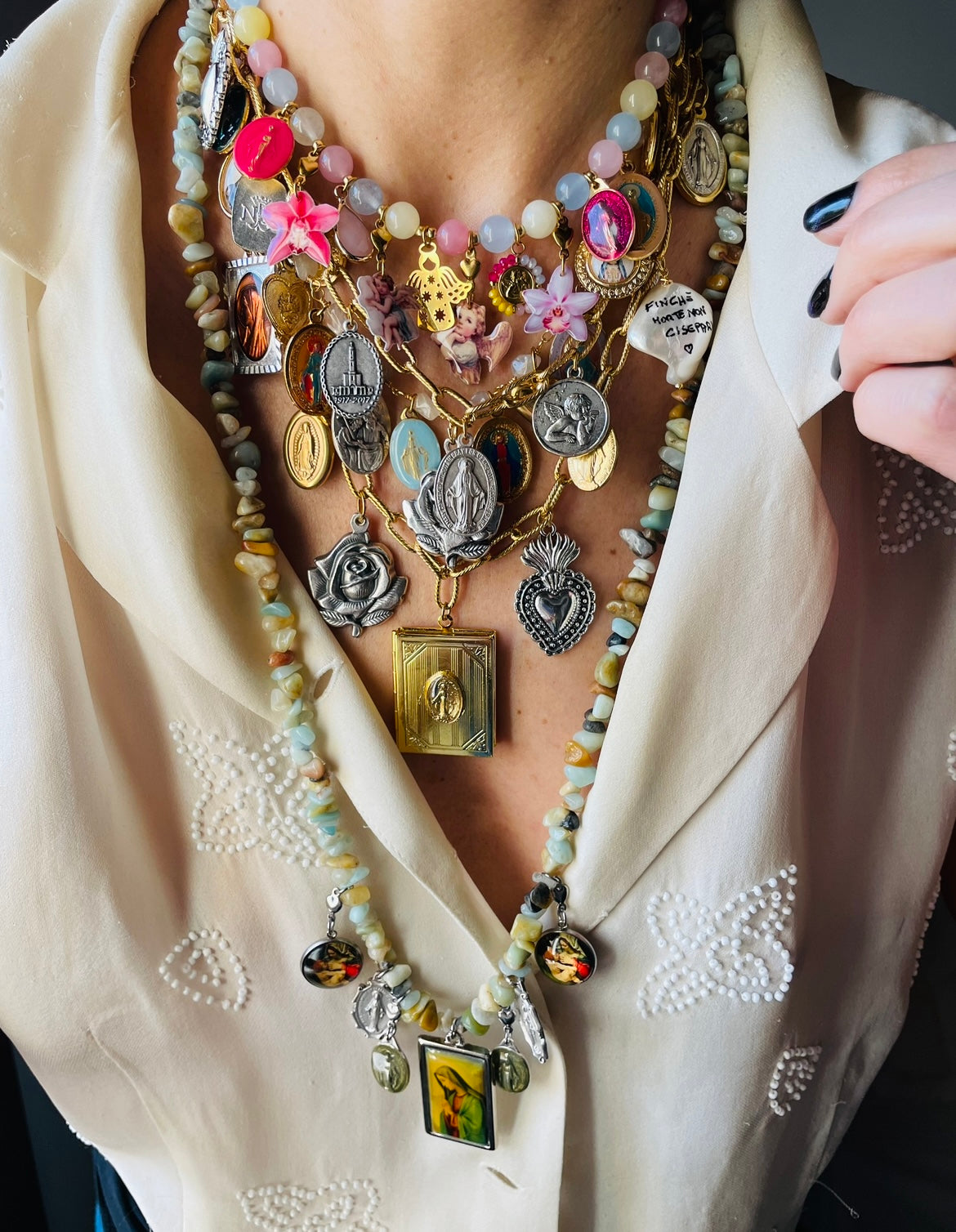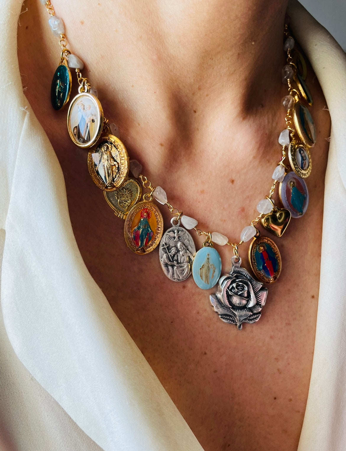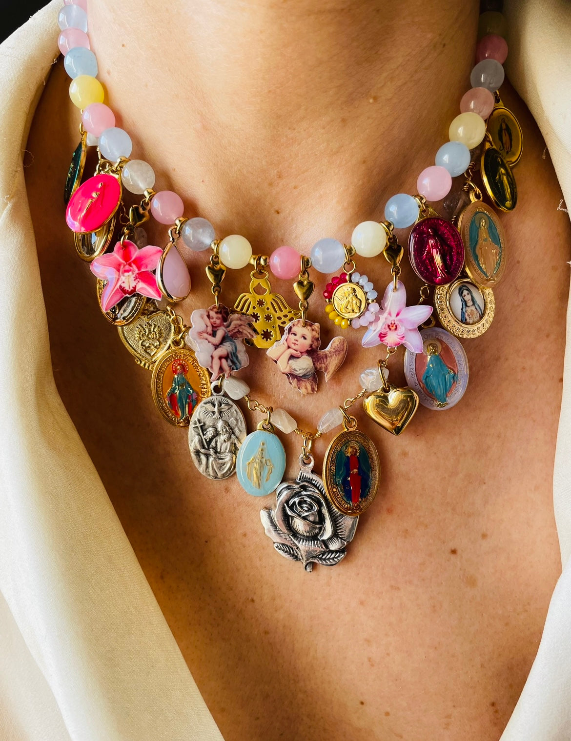 Il modello Alba Gipsy fonde l'estetica bohémien con la profondità della tradizione sacra. Ogni medaglia è un mondo a se: coliri vivaci,riflessi metallici si alternano per creare un gioiello che non sta mai fermo, proprio come te!