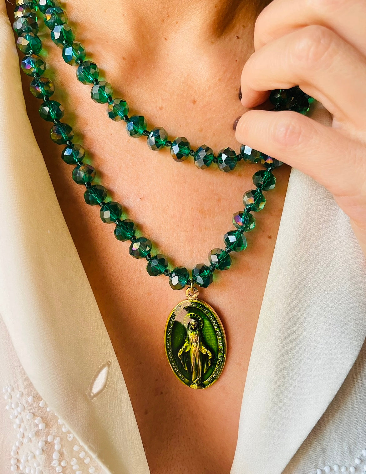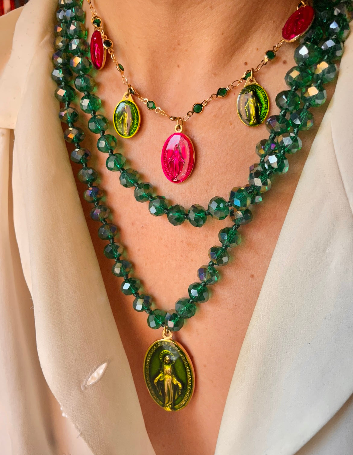 Una collana lunghissima, da indossare in un solo giro oppure doppia, come mostrano le foto. Un filo prezioso di cristalli colorati che culmina al centro con la Medaglia della Madonna Miracolosa.