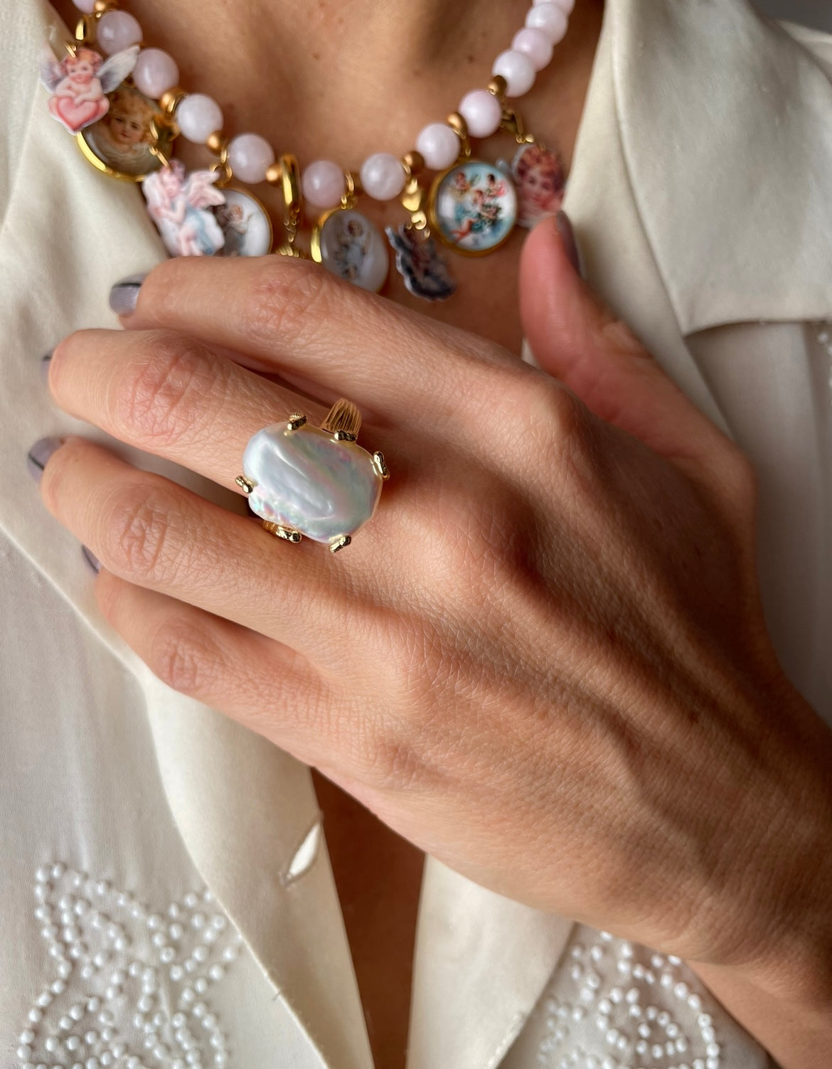 Al centro, una madreperla intarsiata cattura lo sguardo con il suo riflesso naturale, racchiusa in un castone di filigrana dorata.