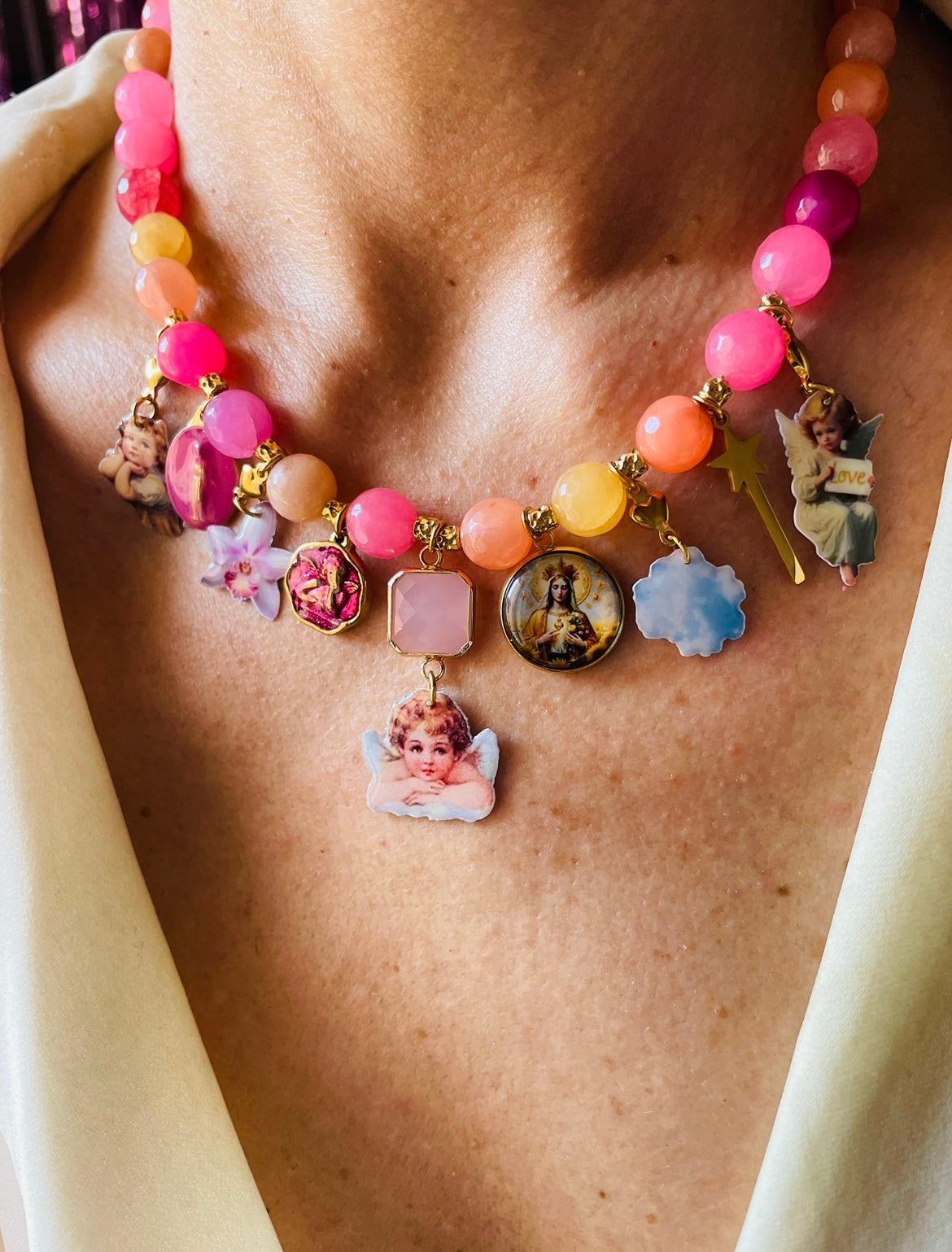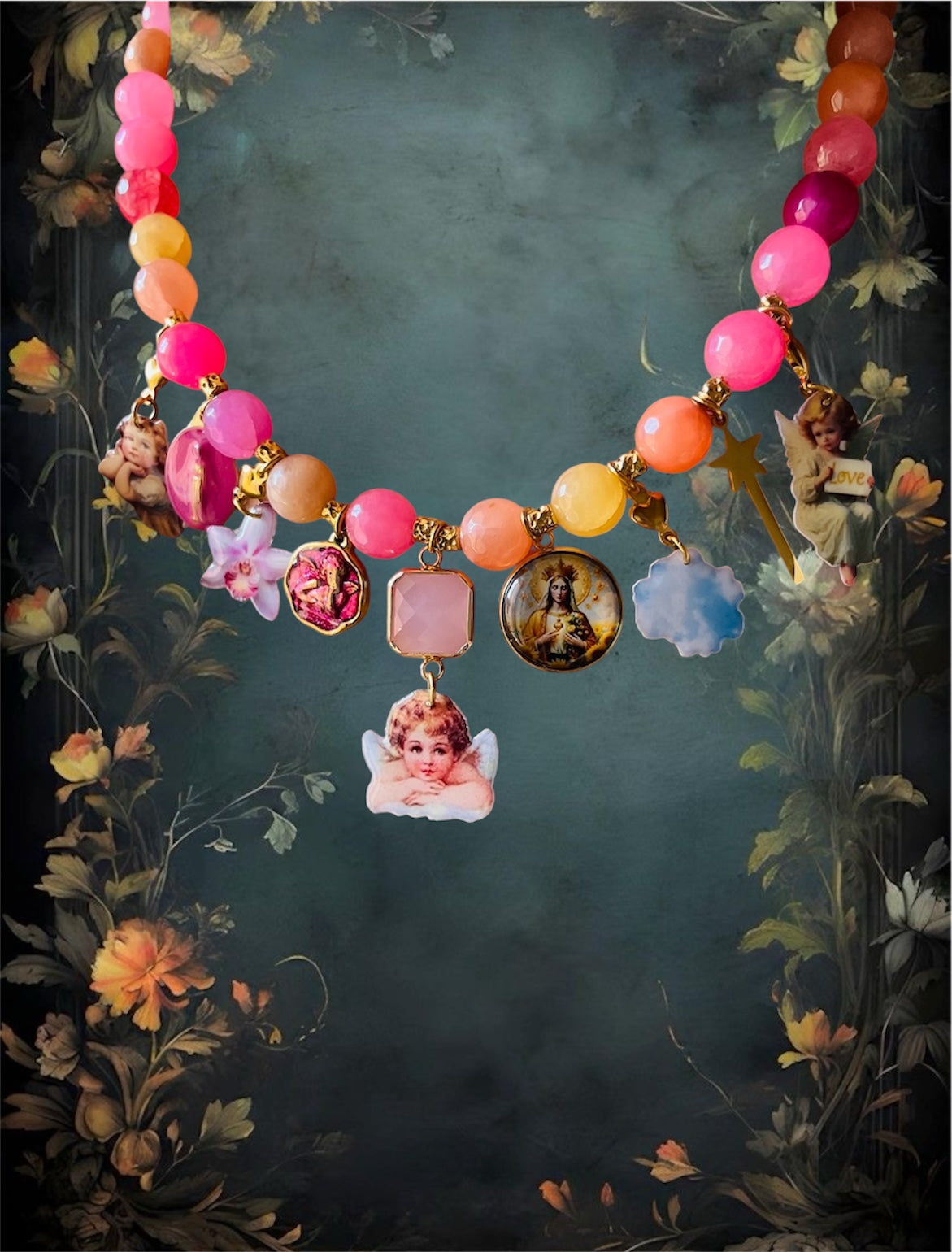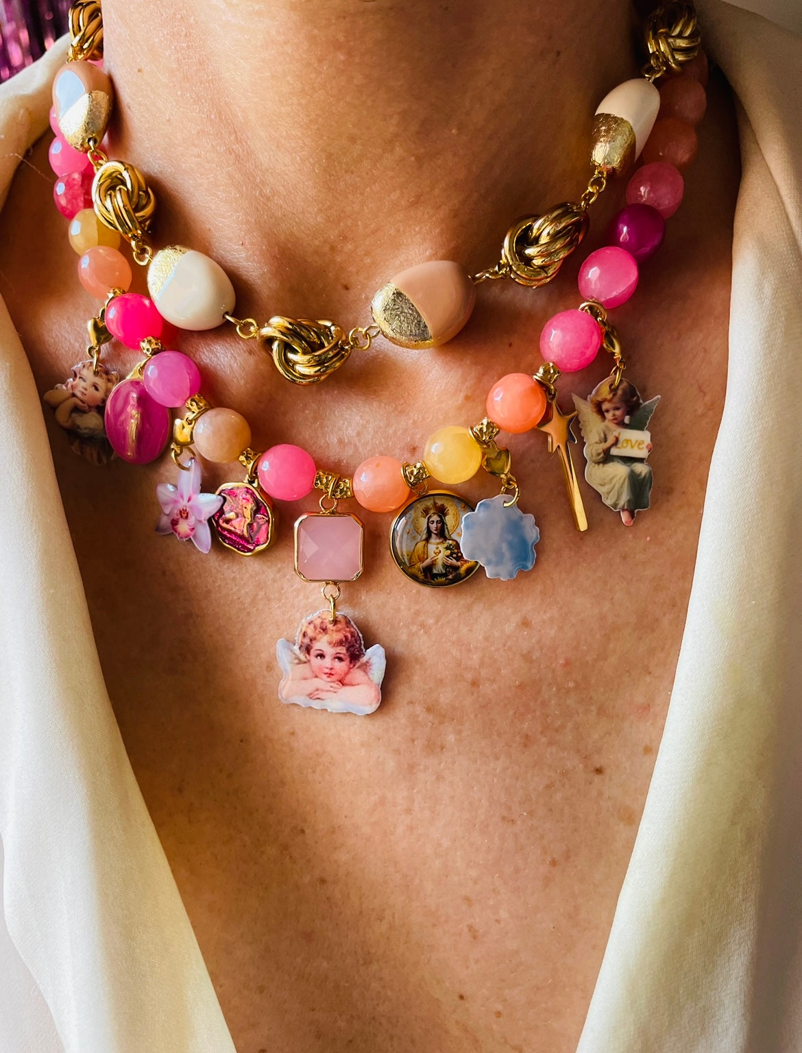 Gli angeli si alternano a perle color pesca e rosa, come piccoli raggi di sole che scaldano il cuore. Le madonnine custodiscono l’energia più tenera e profonda, quella che protegge e illumina i momenti di passaggio.