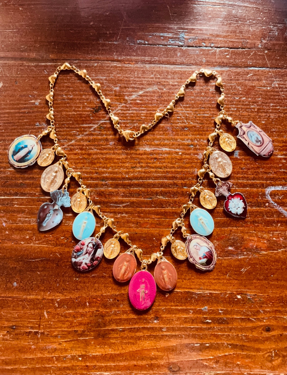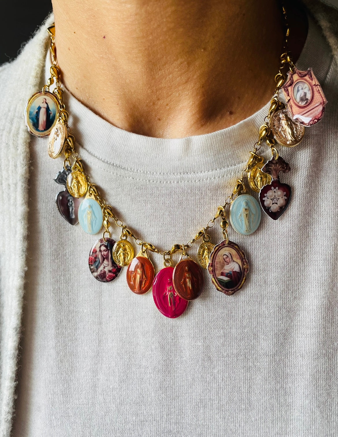 Tra le piccole medaglie miracolose dipinte a mano, dai colori vivi e irregolari, si intrecciano cuori sacri e l’immagine dolce di Santa Bernadette, la fanciulla che vide la Madonna a Lourdes.