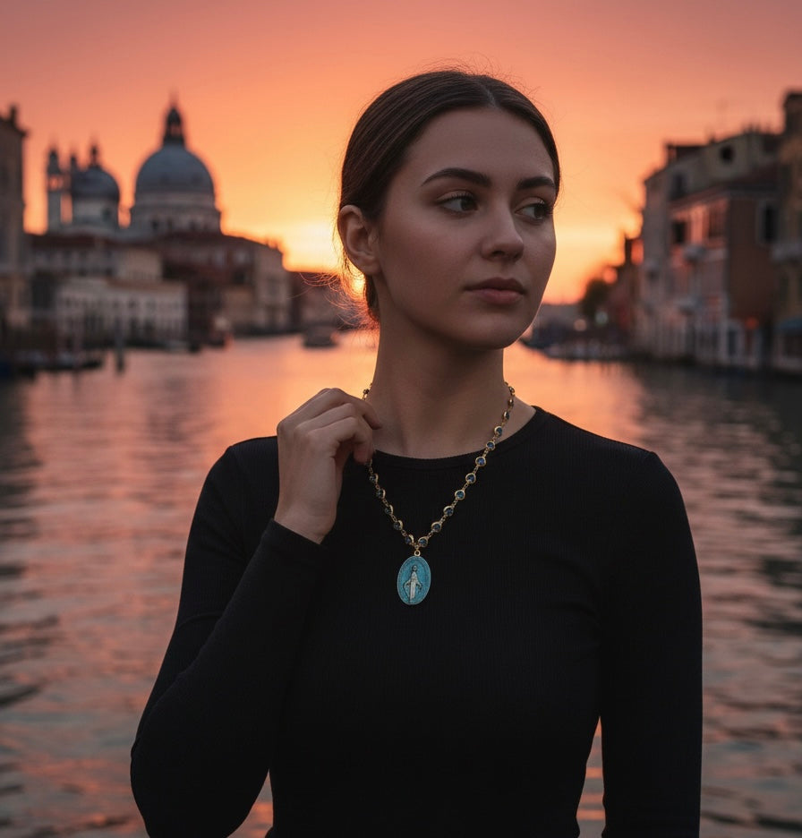 Una collana costellata di cuoricini che sembrano parlare al tuo cuore e una medaglia della Madonna Miracolosa in formato grande: potente, materna, pronta ad avvolgerti nel suo abbraccio invisibile.