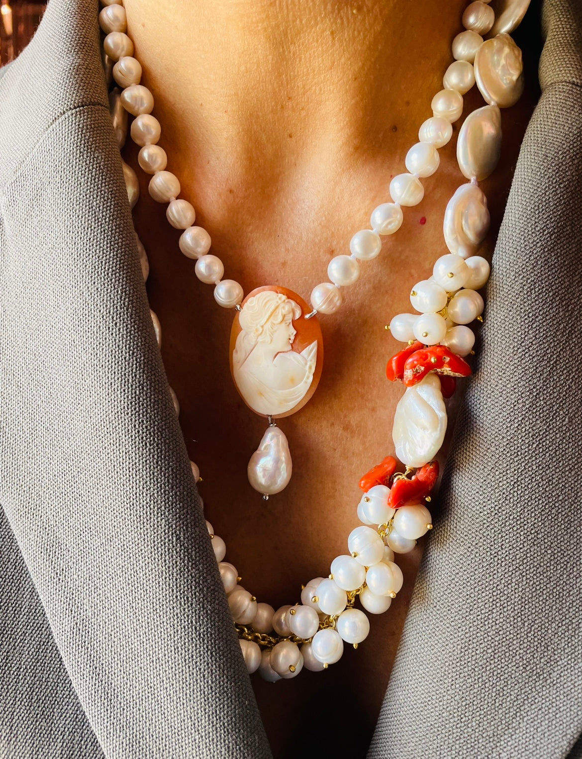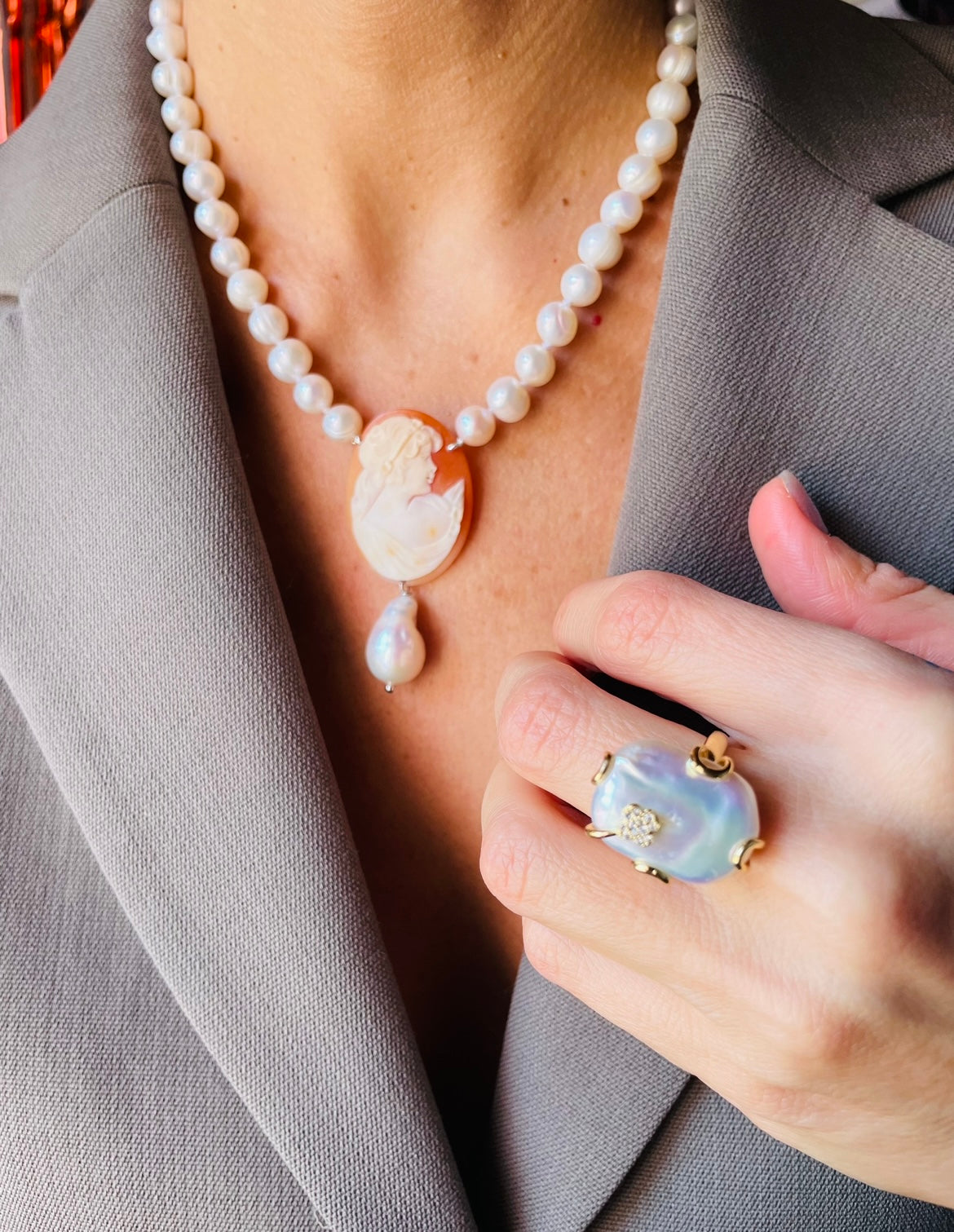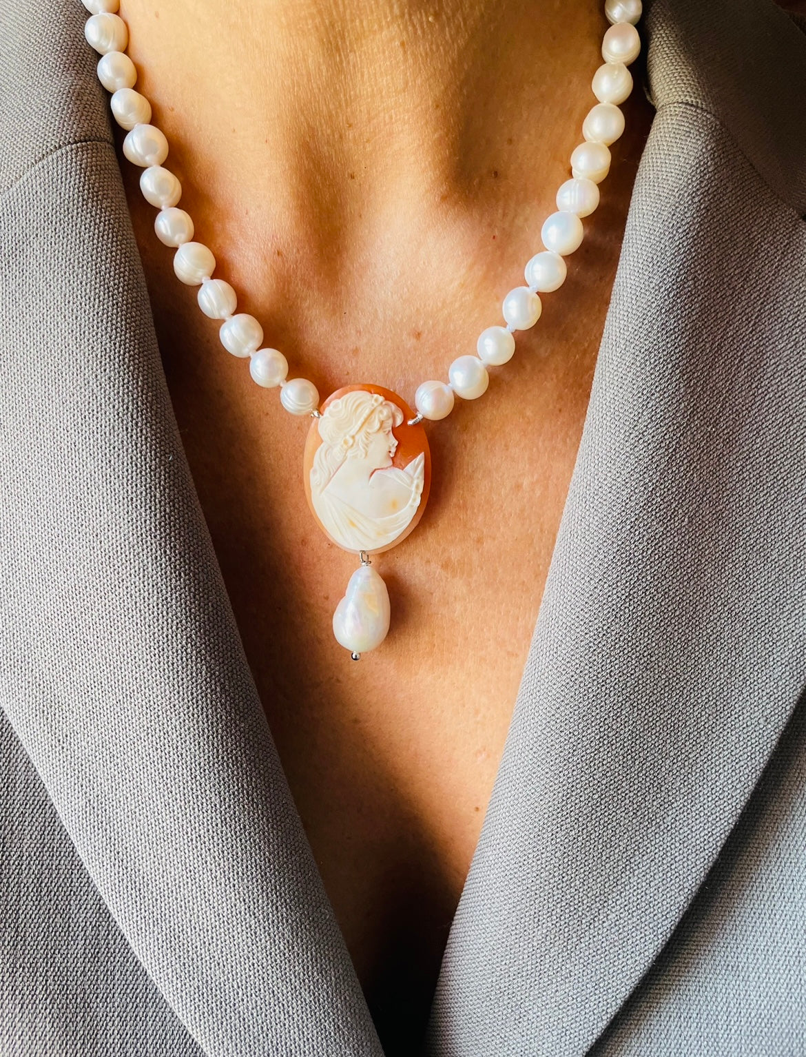Sotto al cammeo si posa una perla delicata che aggiunge movimento e raffinatezza al gioiello.