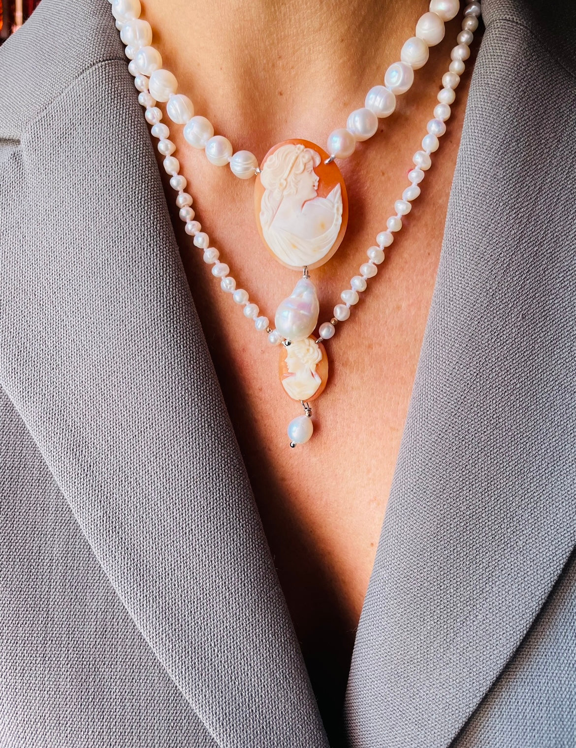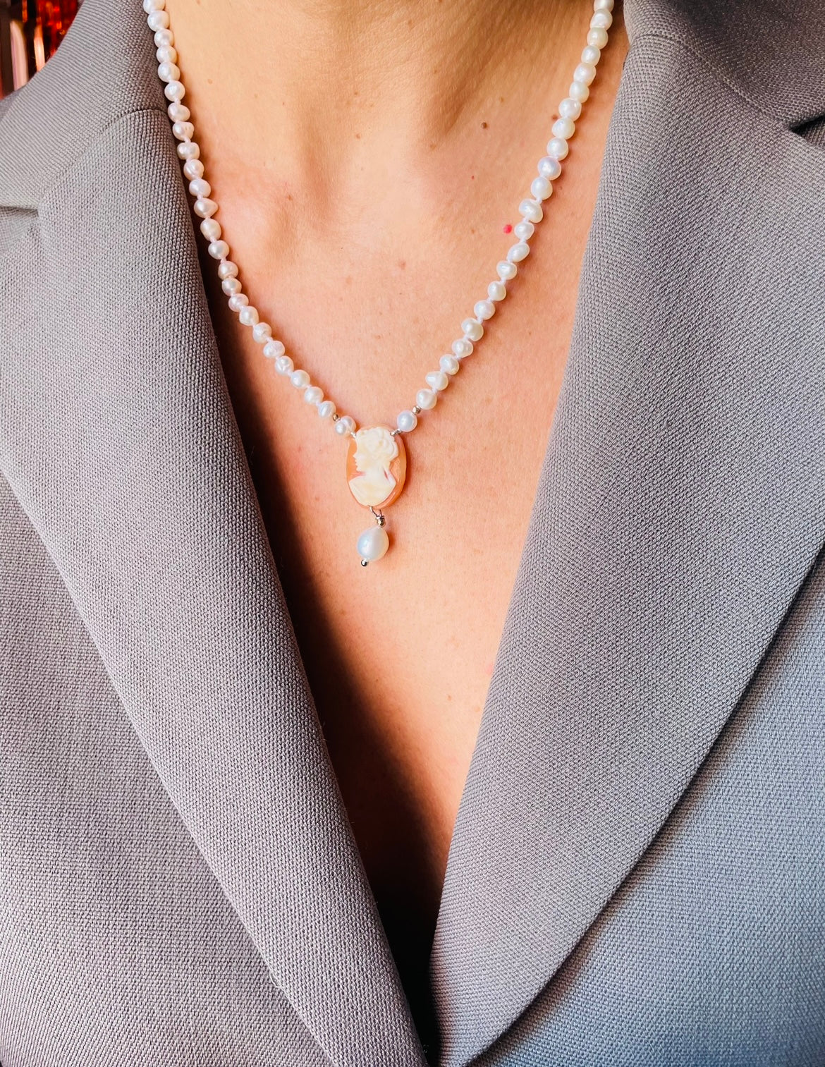 Sotto al cammeo si posa una perla delicata che aggiunge movimento e raffinatezza al gioiello.