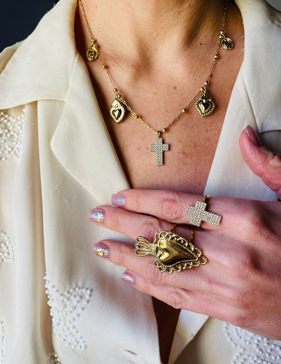 Indossala e sentiti al sicuro grazie alle sue madonnine, cuori sacri e croce centrale zirconata.