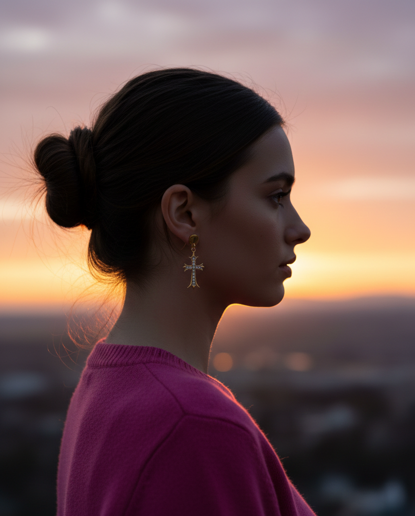 Questi splendidi orecchini a croce sono finemente tempestati di zirconi scintillanti che catturano la luce ad ogni movimento.