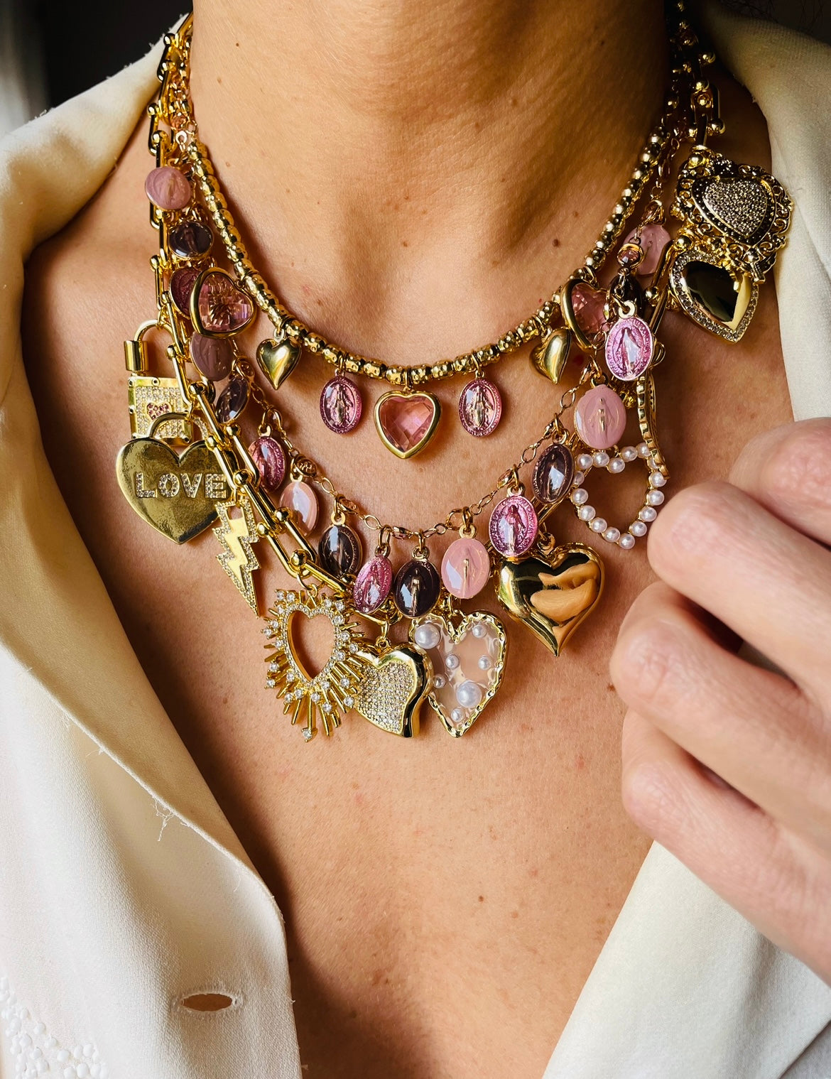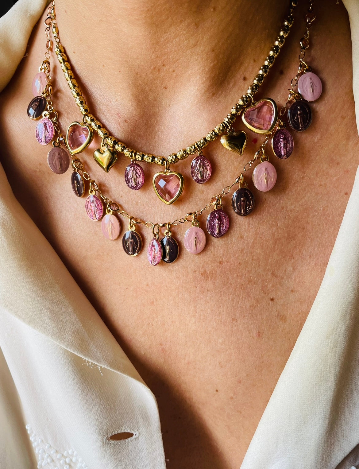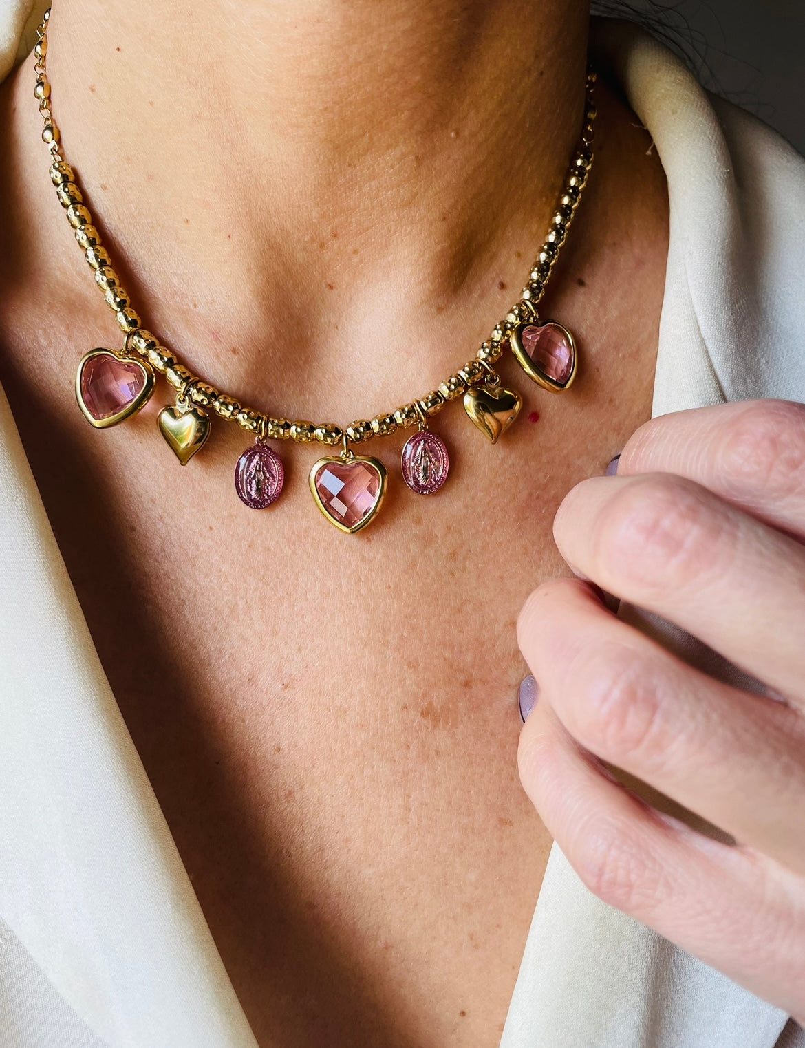 Chocker composto da granelli che terminano con una catenina a bolle nella parte finale,pendagli a forma di cuore e madonnine dipinte a mano.