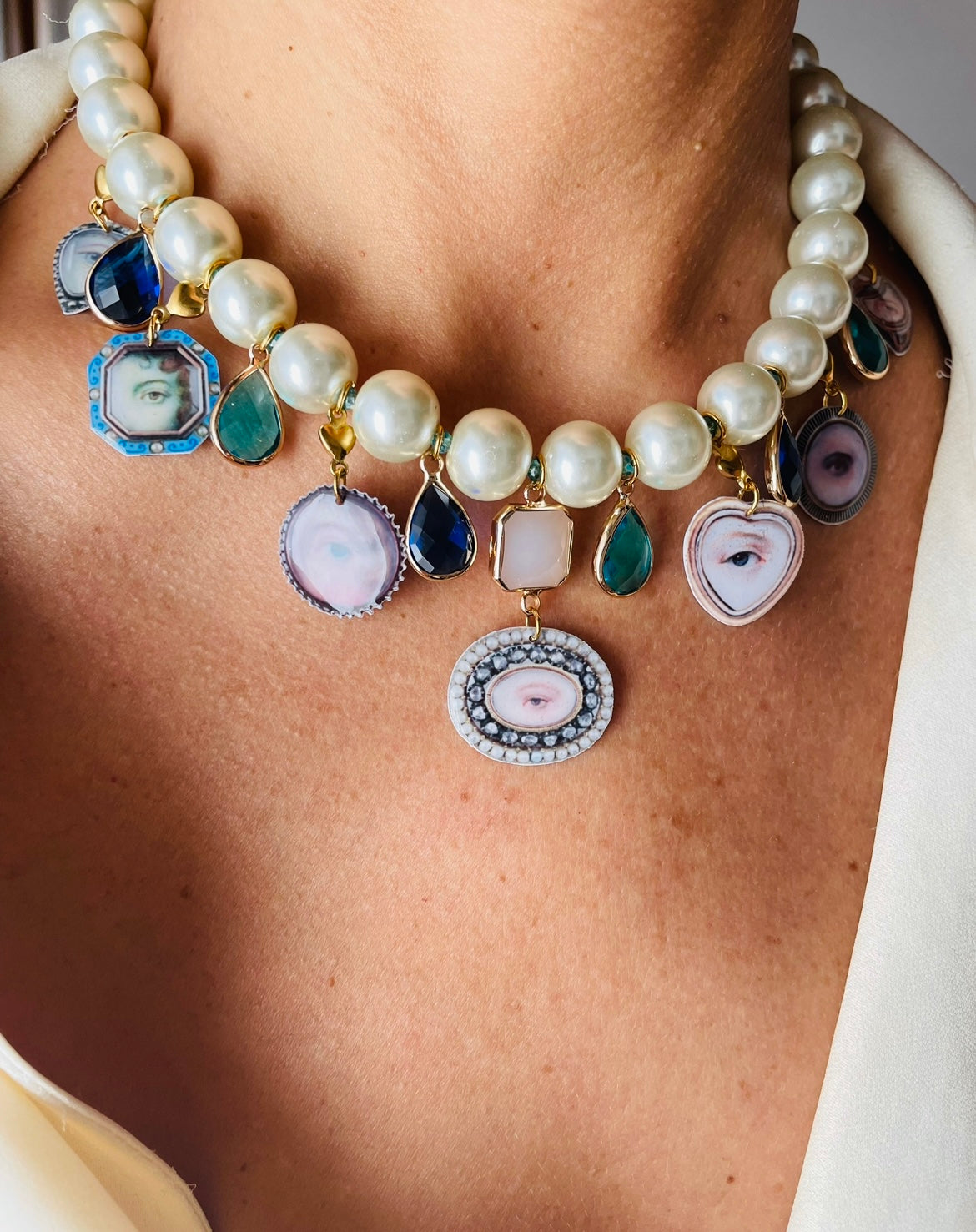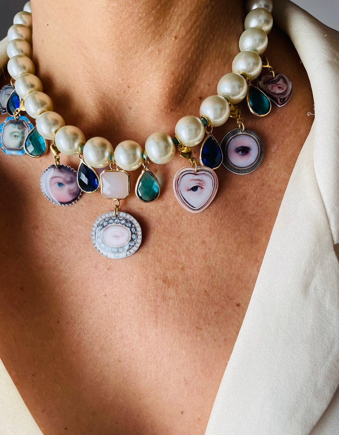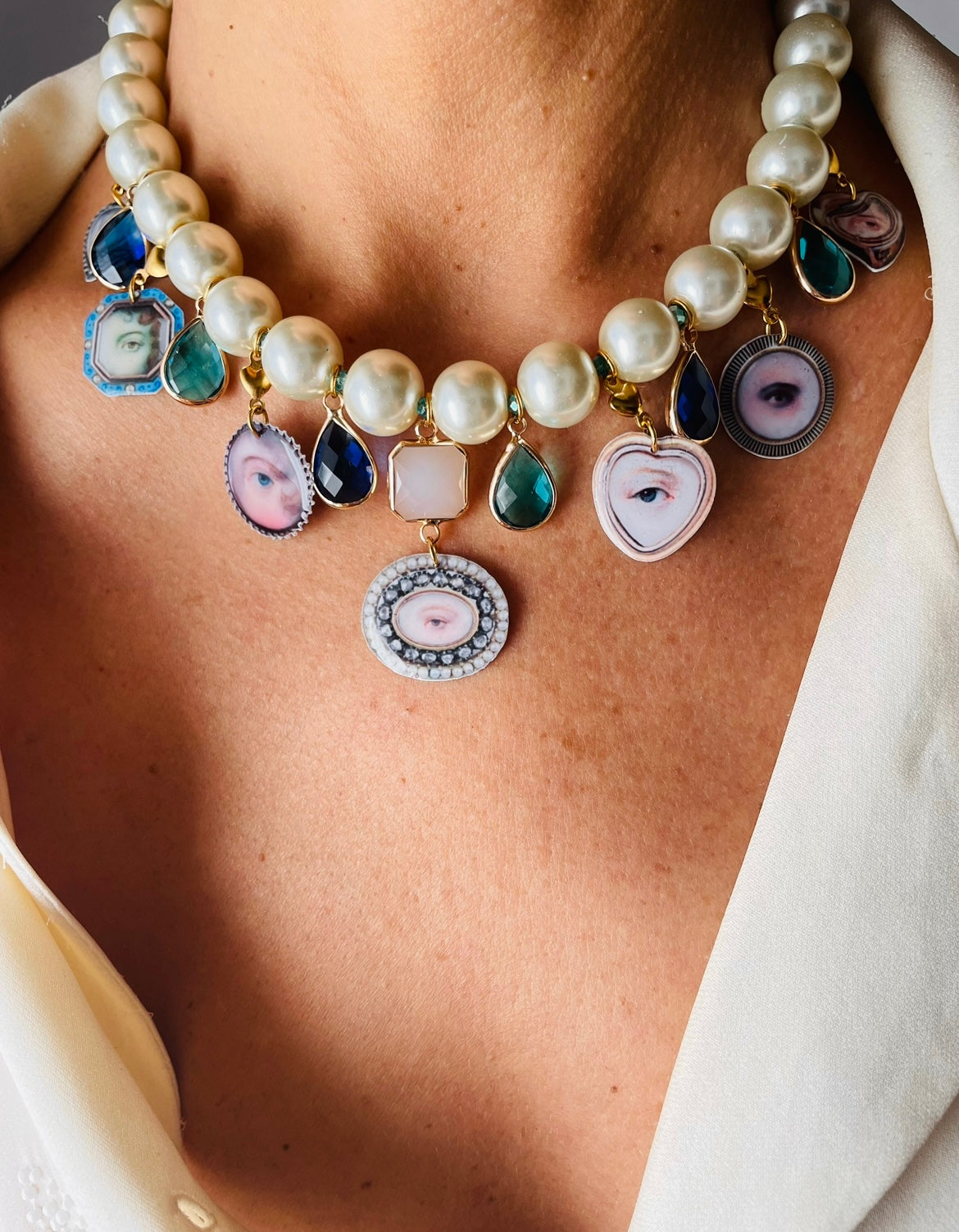Questa collana cm unisce perle bianche luminose a pendenti unici raffiguranti gli Occhi degli Amanti.