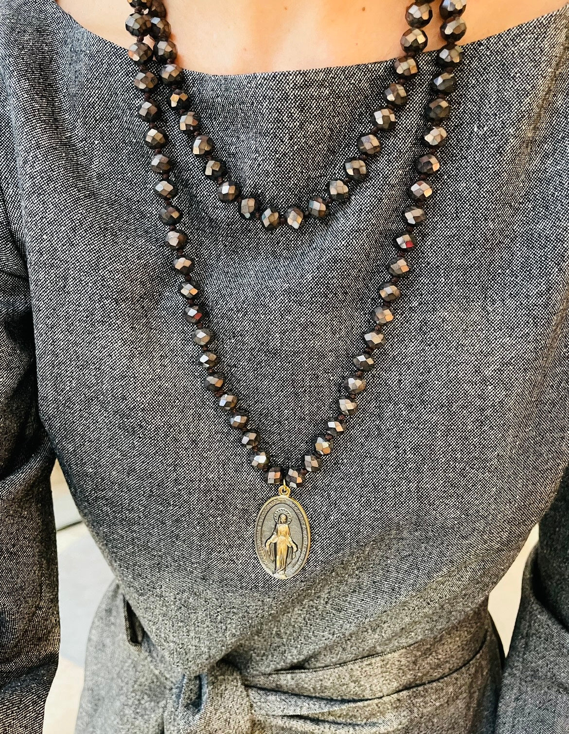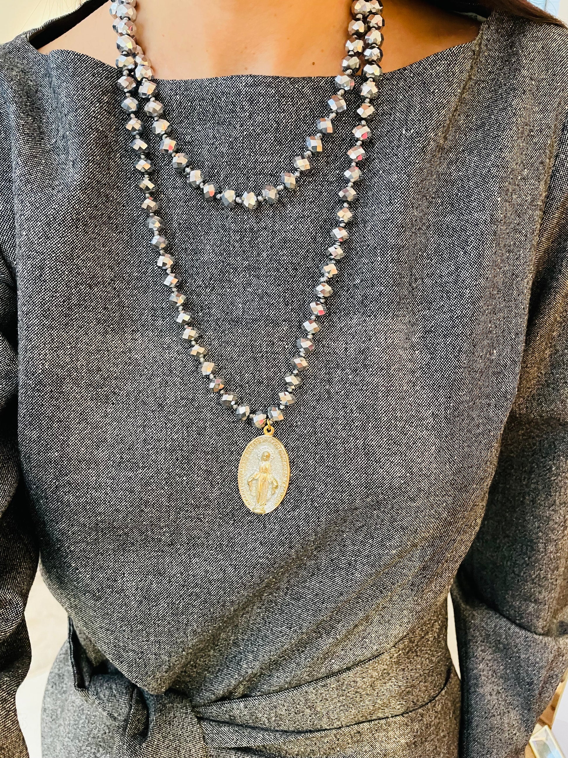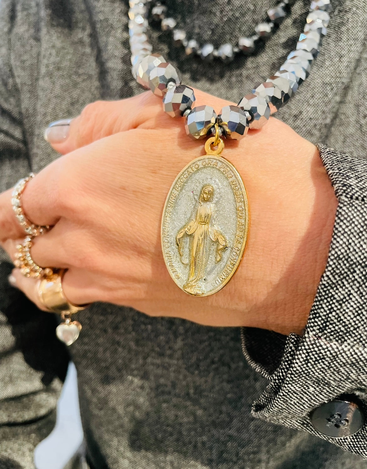Un filo prezioso di cristalli colorati che culmina al centro con la Medaglia della Madonna Miracolosa.