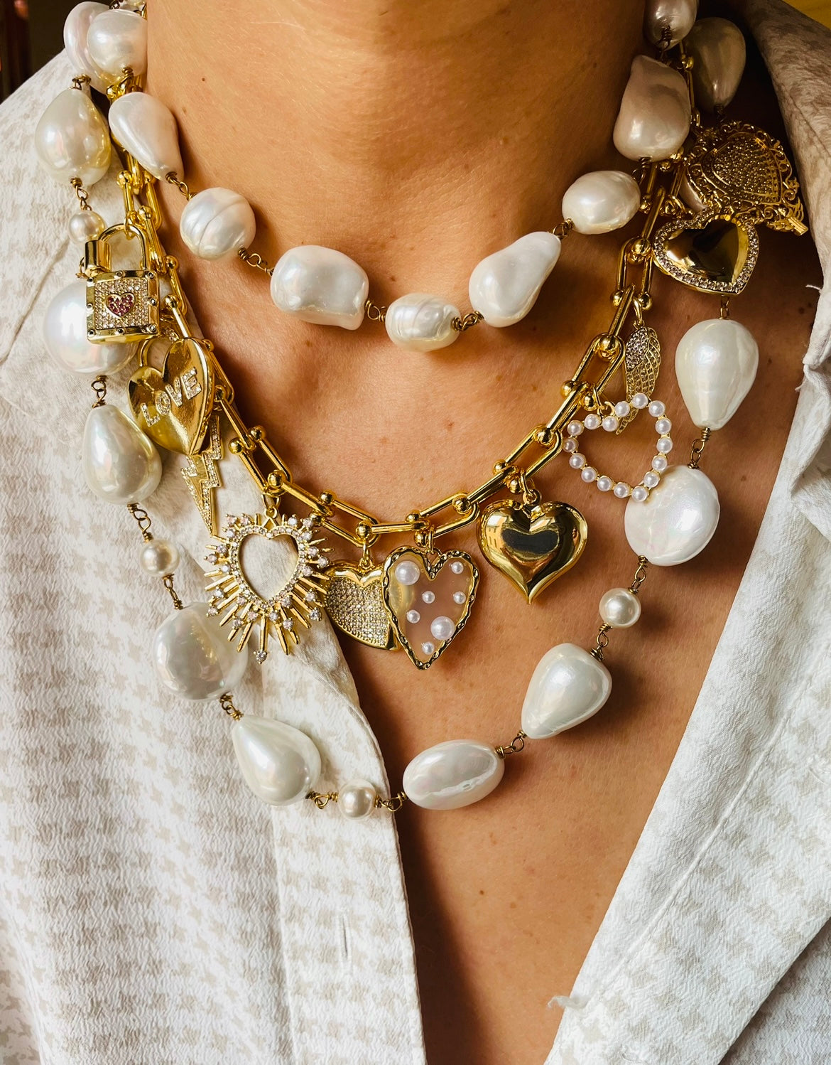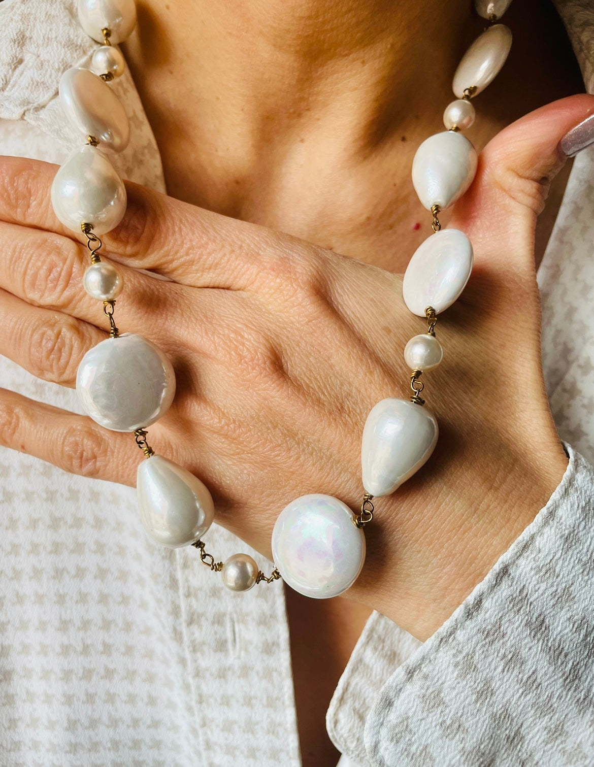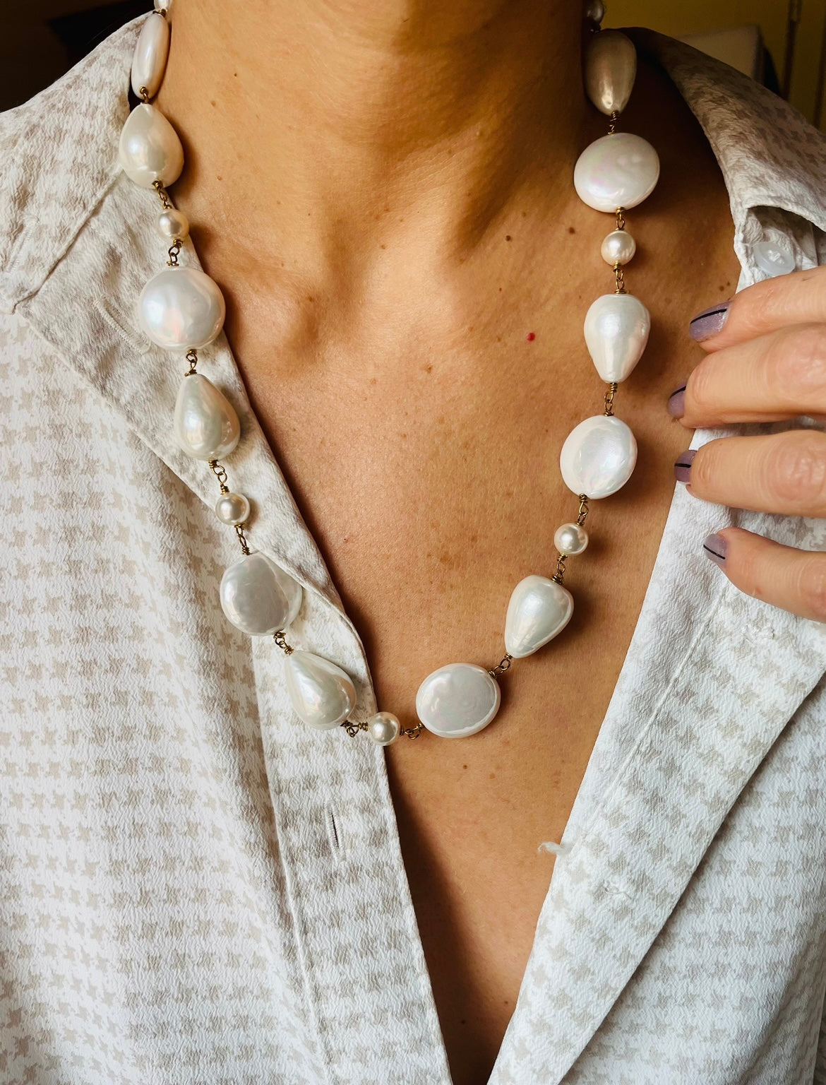 Una collana lunga 51 cm che unisce perle barocche e piccole perle rotonde di maiorca, intrecciate con la tecnica rosario.
