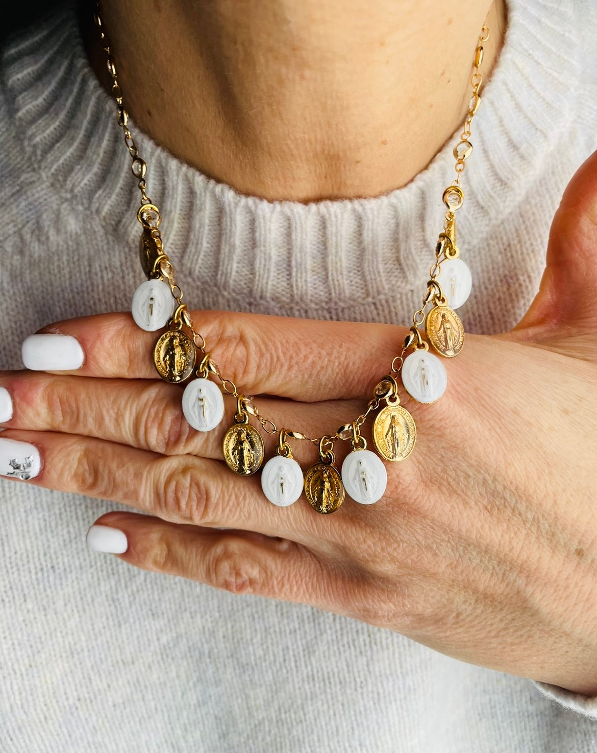 Ogni medaglia, in un delicato formato mini, raffigura l'immagine sacra della Madonna Miracolosa ed è meticolosamente dipinta a mano in un'armoniosa combinazione di bianco puro e oro lucente.