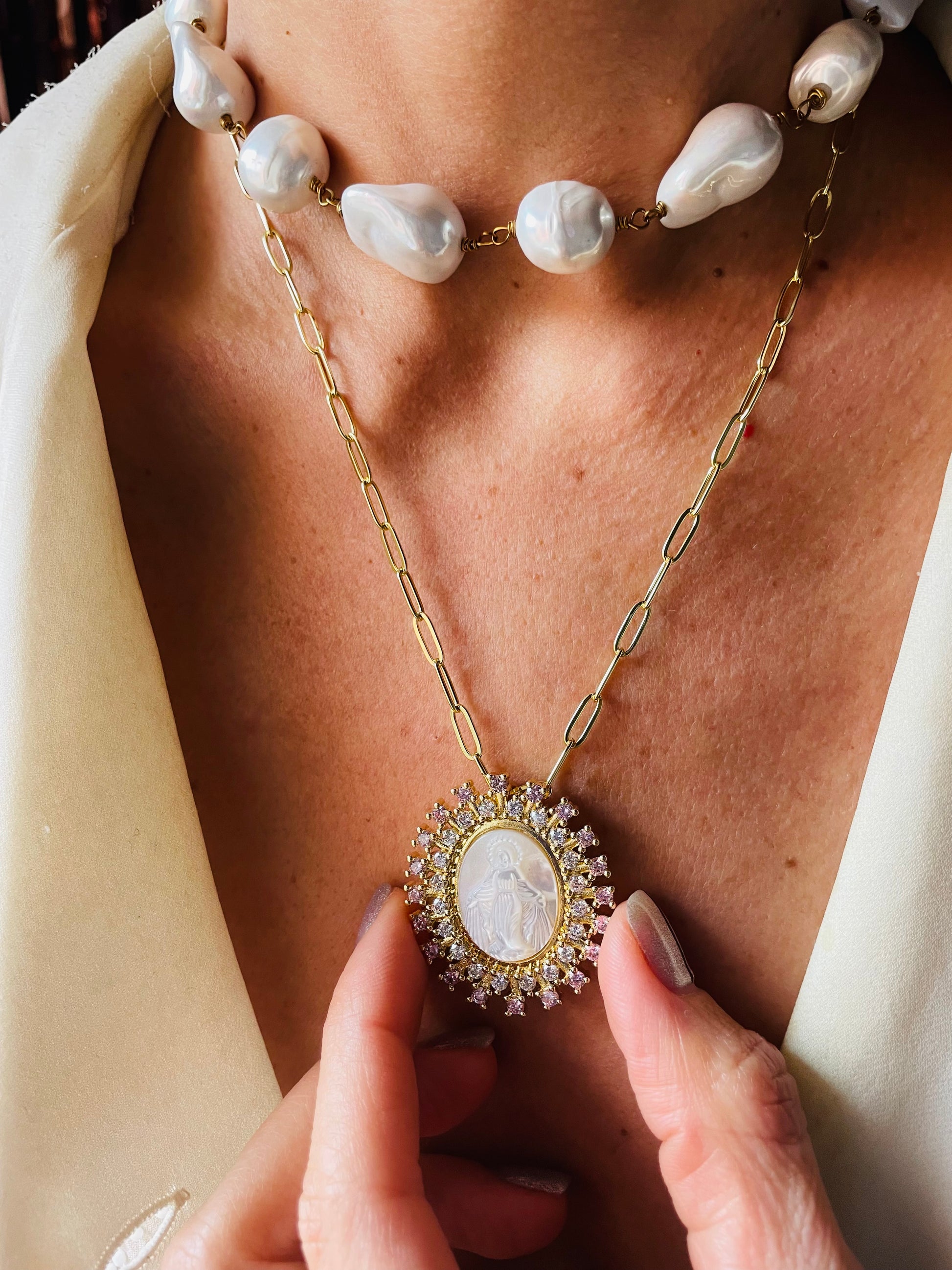 Collana in acciaio dorato con medaglione in madreperla raffigurante la Madonna.