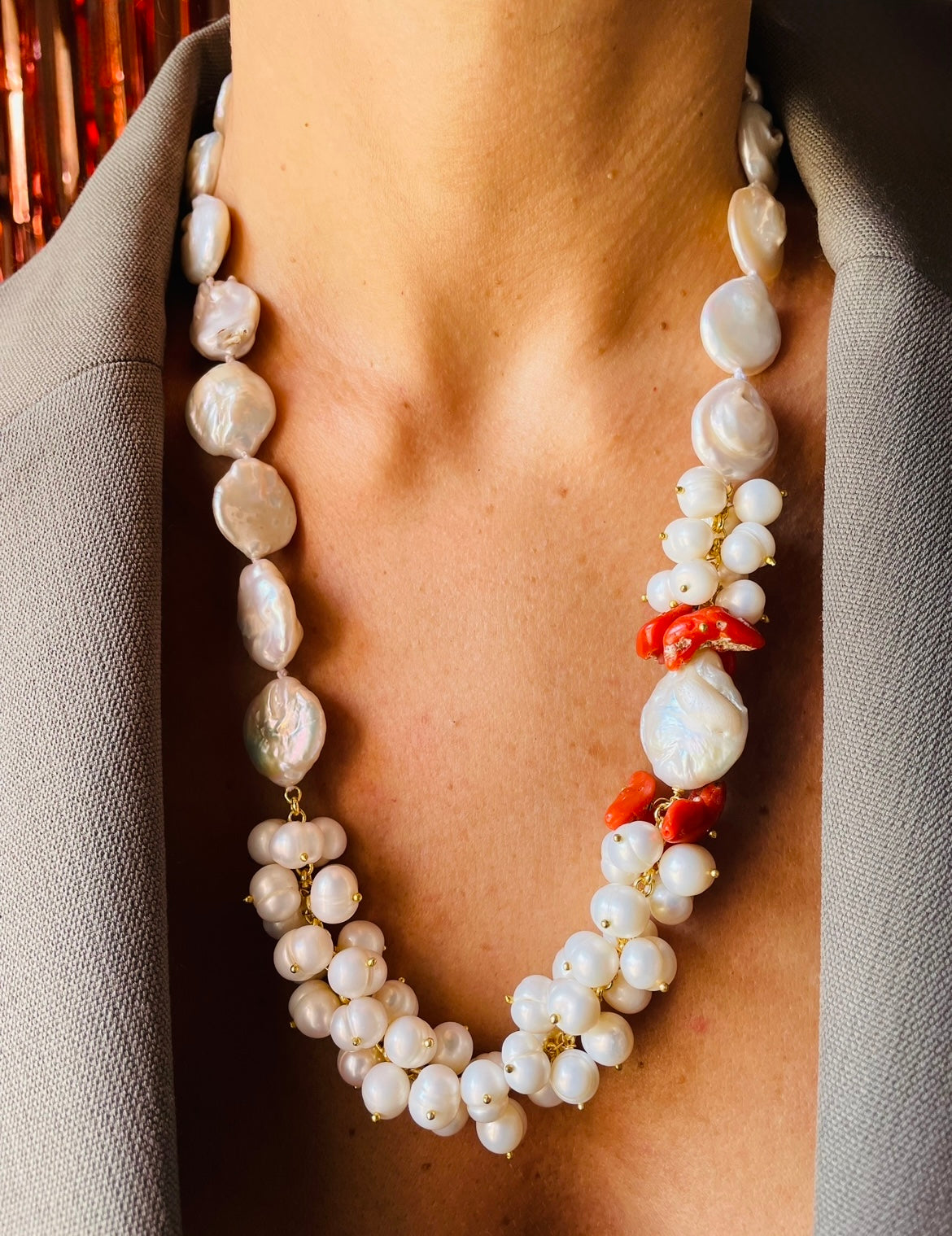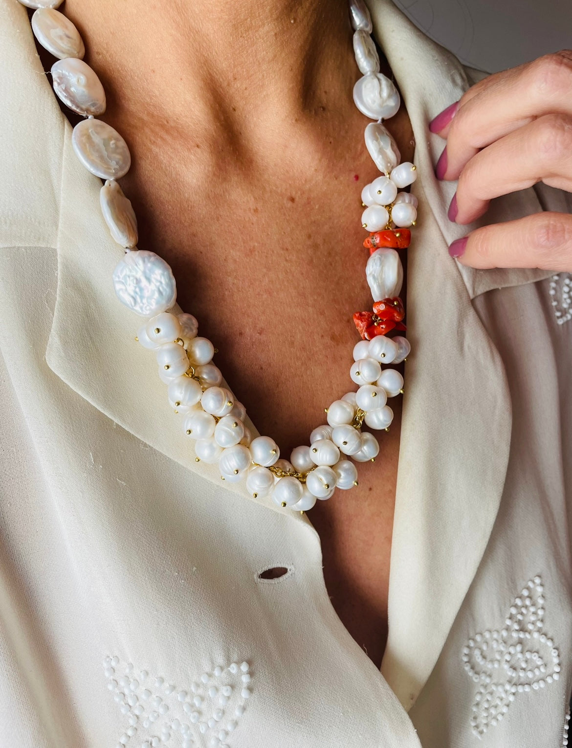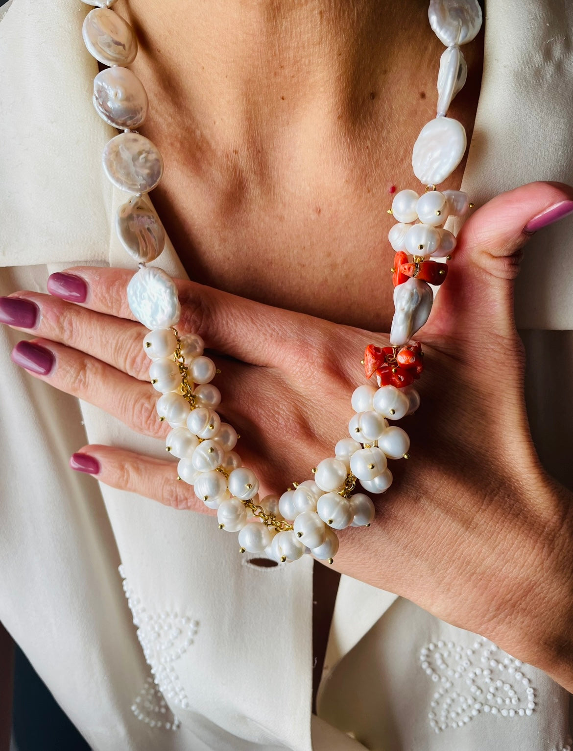 Un intreccio di perle barocche e di fiume, con tocchi di corallo rosso che accendono la composizione come piccole scintille di vita.