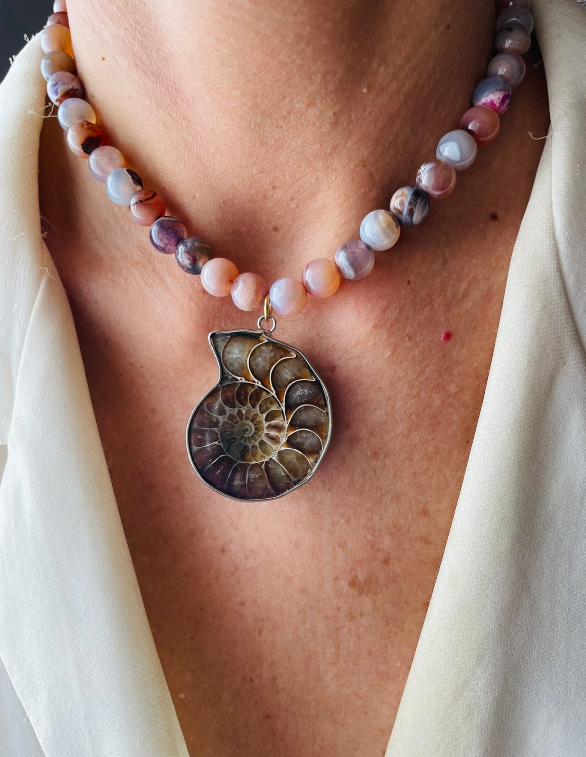 Il pendaglio centrale è una ammonite fossile, una pietra che racchiude milioni di anni