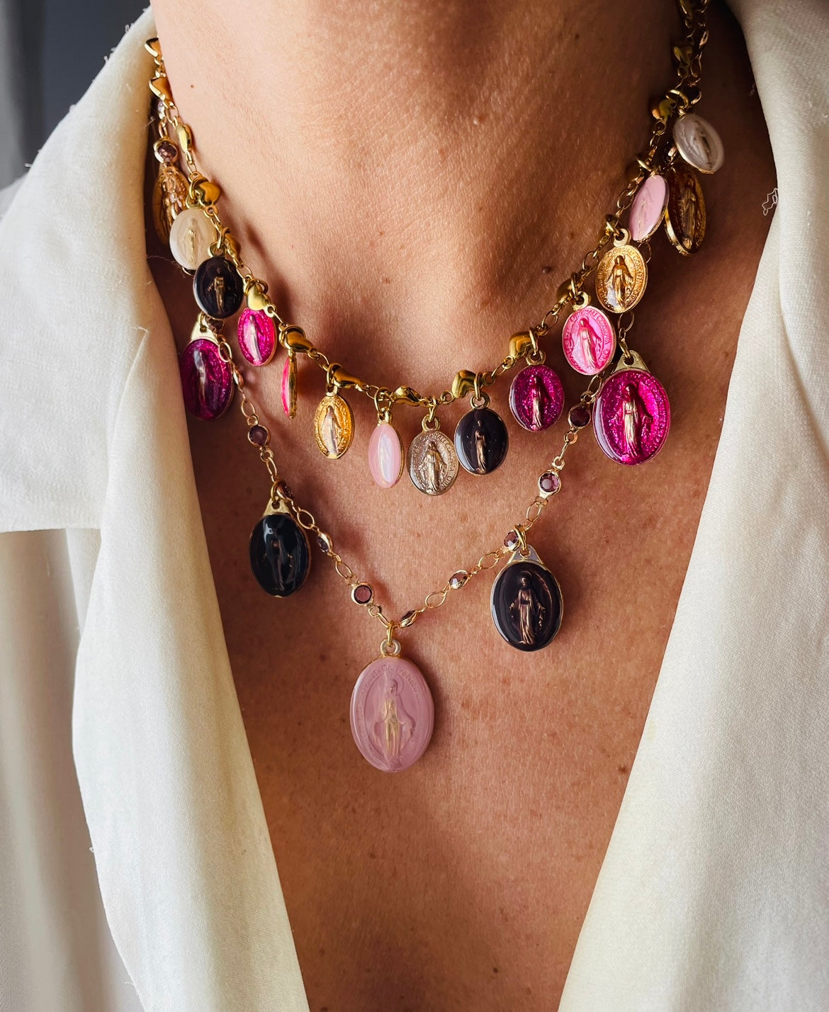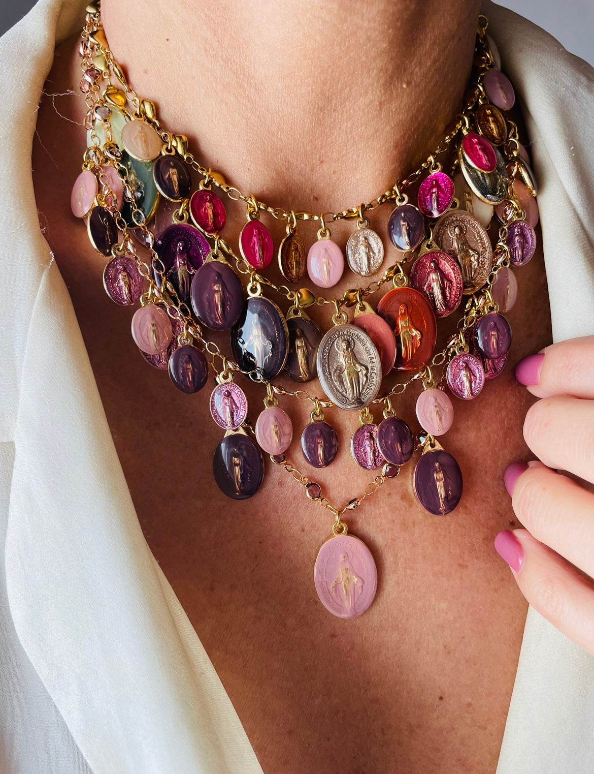 La collana che trasforma l’inverno. Piccole medaglie miracolose, dipinte una a una, si tingono di burgundi, vinaccia, bronzo, fucsia, crema e rosa antico, creando un insieme vivo e cangiante
