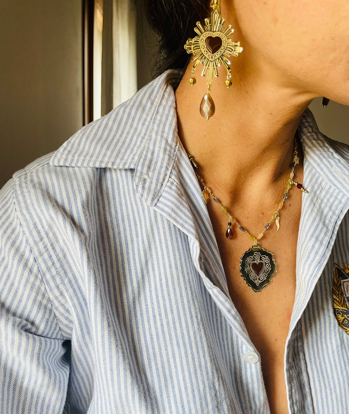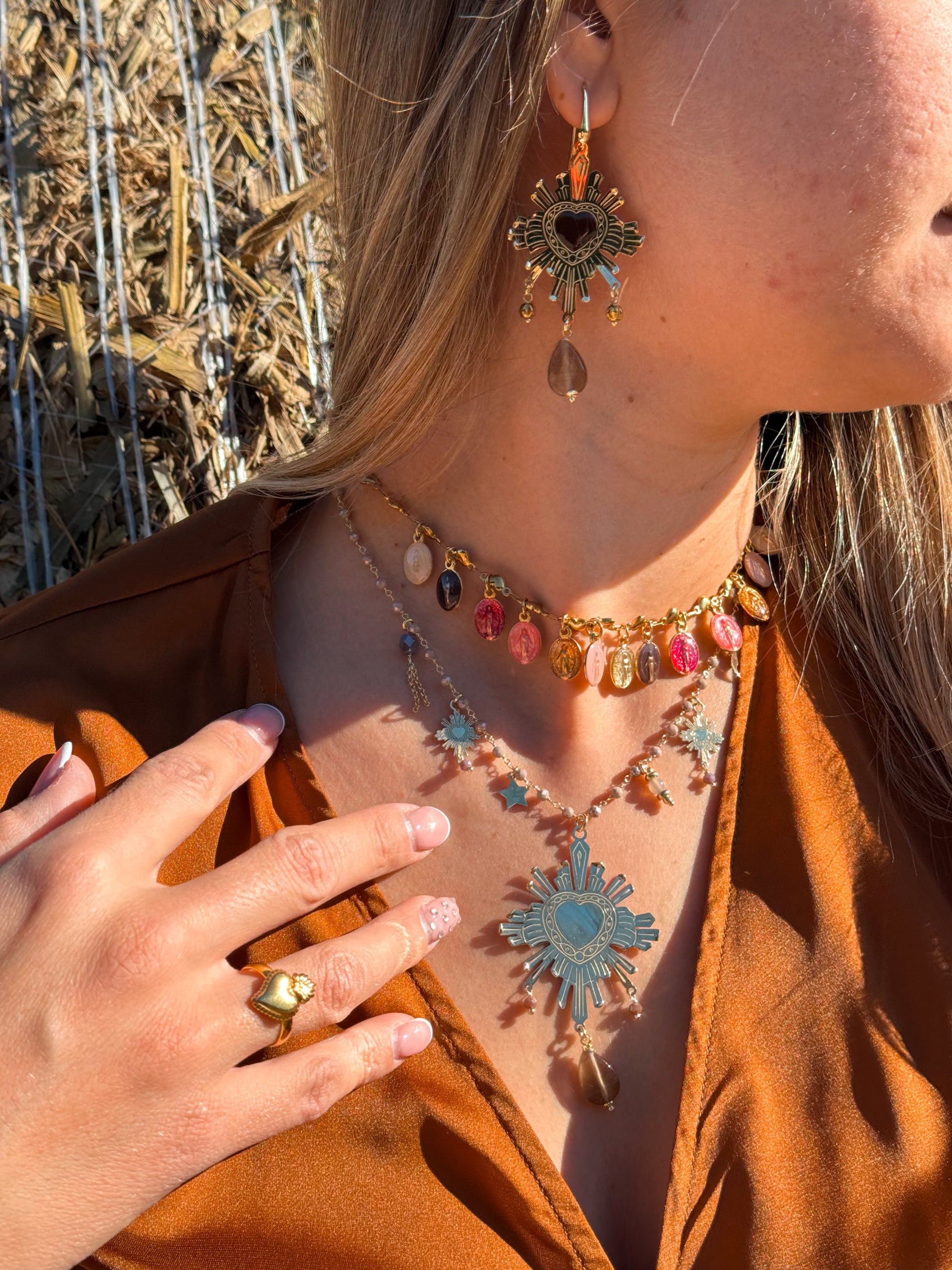 Sono orecchini che raccontano di protezione, di passione e di viaggi lontani, perfetti da indossare con la collana coordinata per un effetto scenico irresistibile.