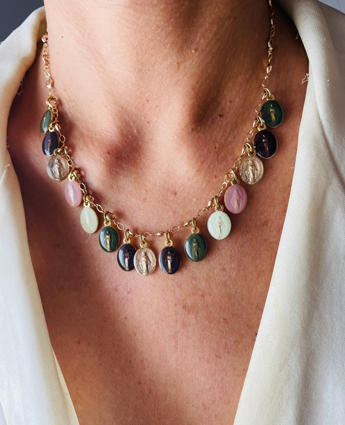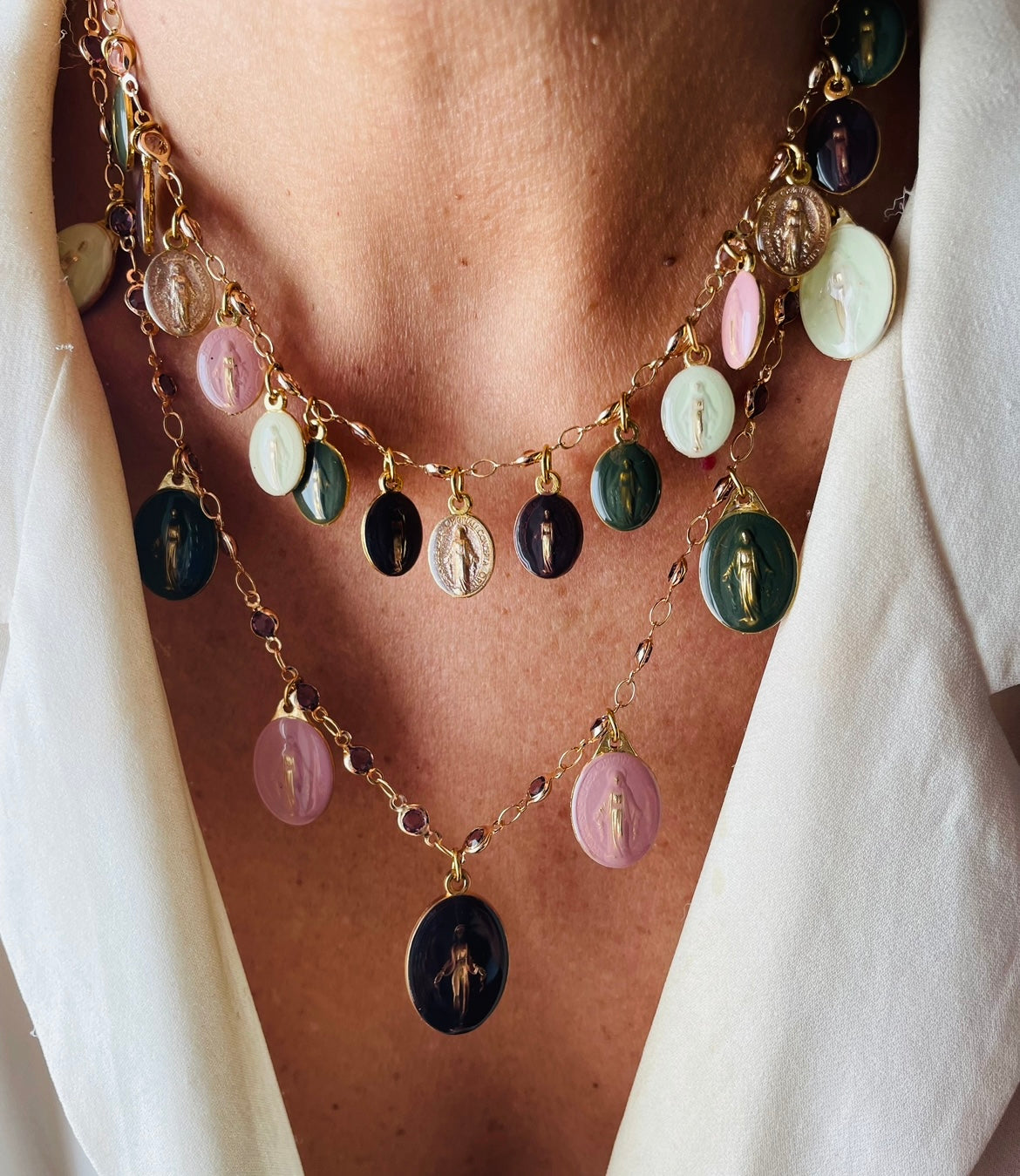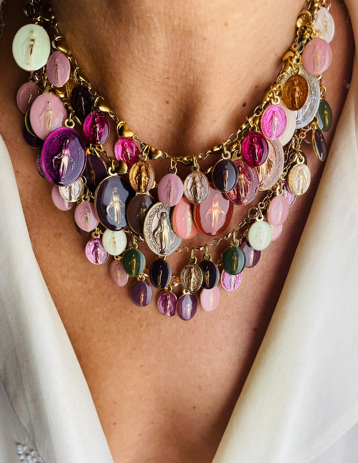 Medaglie in zama dipinte a mano, catena in rame con cristalli.