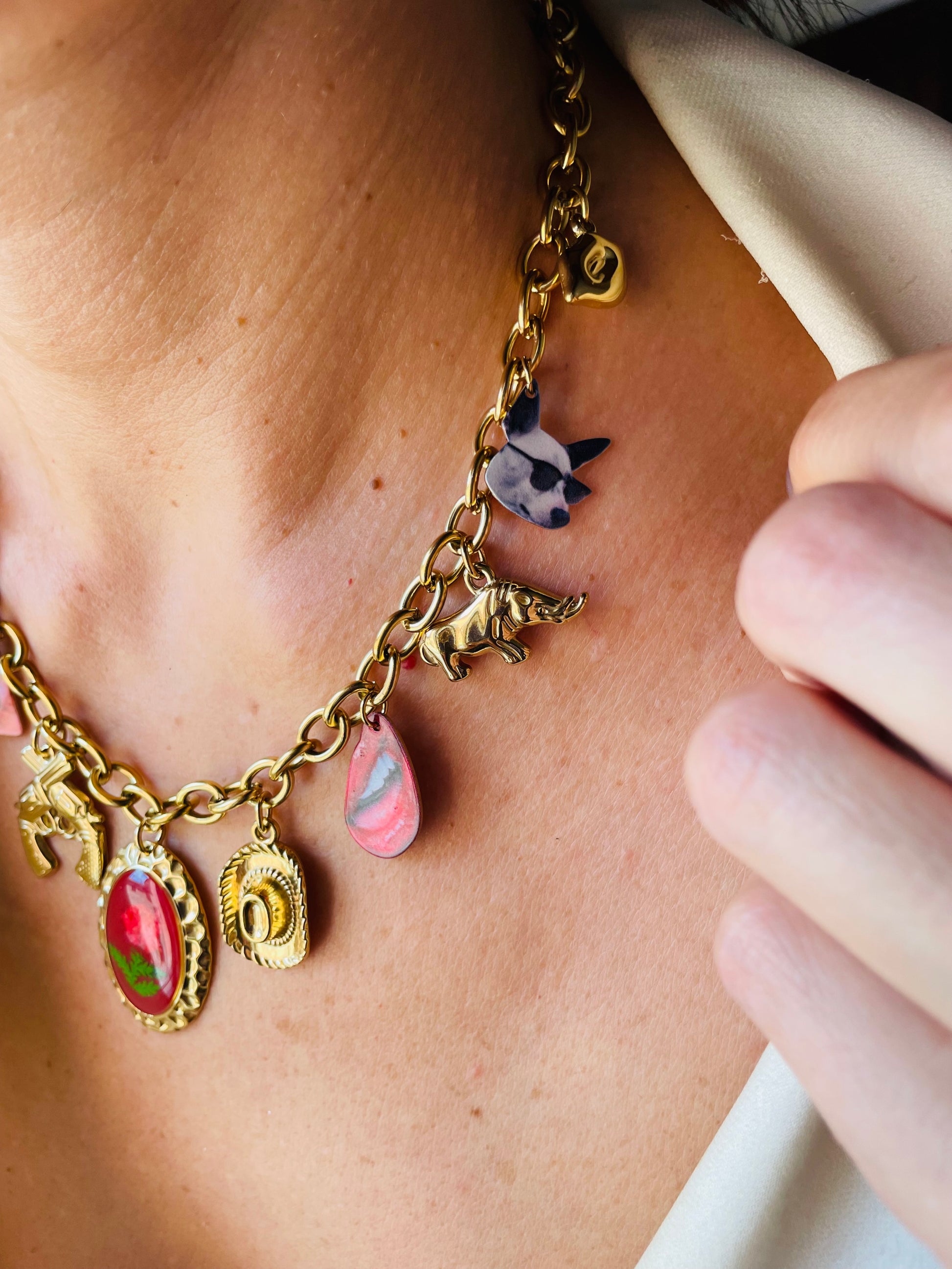 Realizzata in acciaio inossidabile dorato, è arricchita da charm che raccontano lo spirito libero del Texas: lo scudetto dello sceriffo, le pistole incrociate e il cappello da cowboy.